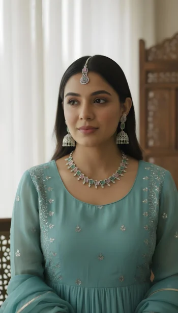 ₹3,219.00Original price was: ₹3,219.00.₹2,299.00Current price is: ₹2,299.00.You Save ₹920.00 (29% Off)Add to cartContemporary pastel-toned necklace featuring soft pink and mint green stones outlined in AD sparkle, giving a chic yet graceful aura.