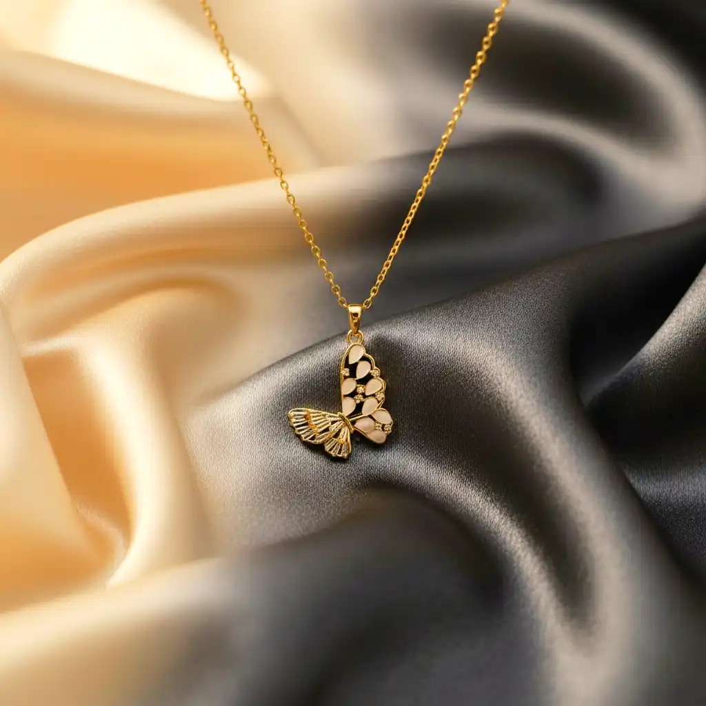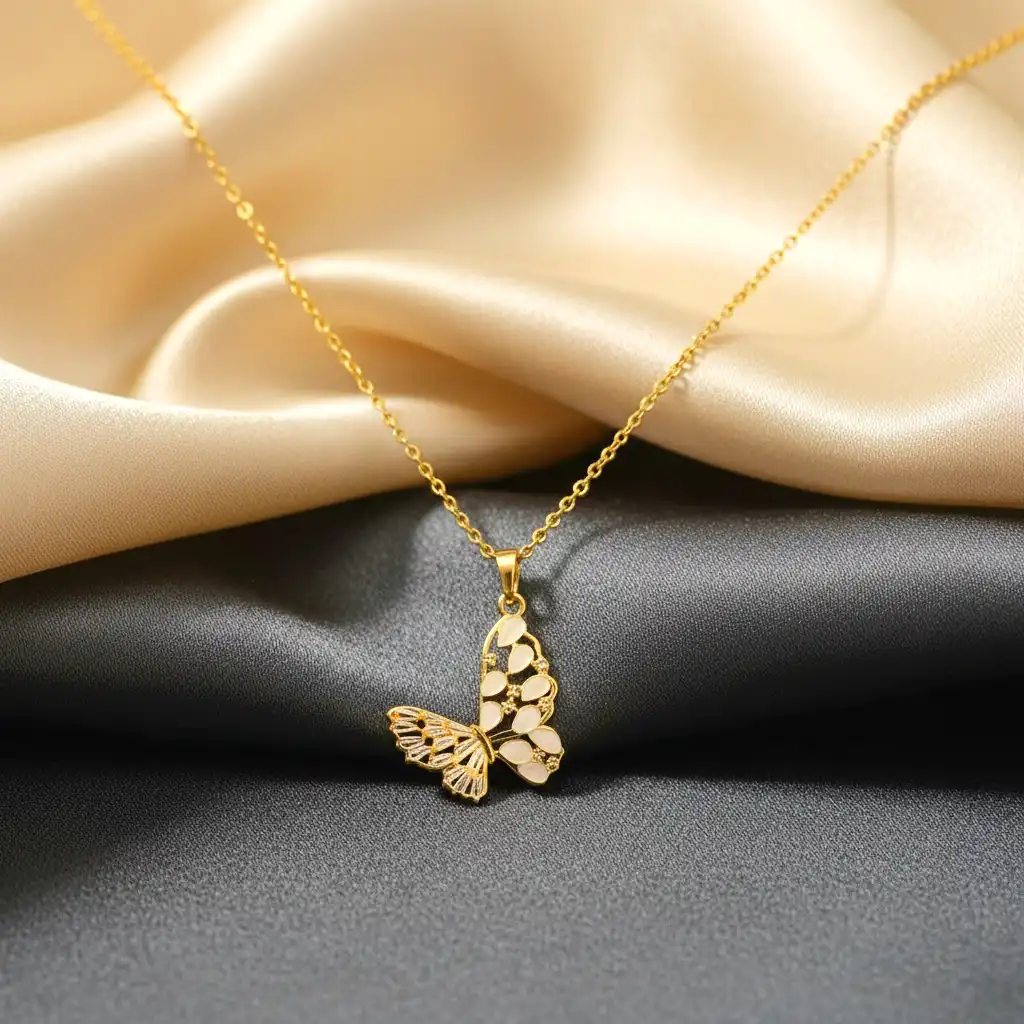 This elegant butterfly pendant necklace features intricate detailing with delicate enamel wings that create a graceful and artistic design. The fine gold chain complements the pendant, making it a stylish yet subtle statement piece.