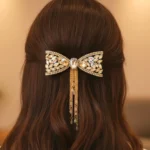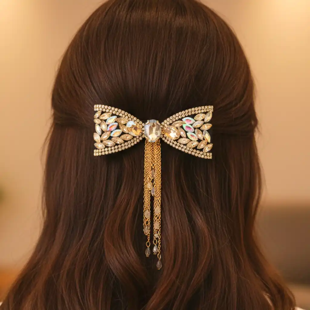 Material & Color: Made with a fabric with a plastic bow base, gold-tone alloy metal detailing, and high-quality crystal stones. The clip mechanism at the back is usually metal (alloy or steel) to provide a strong grip on the hair.