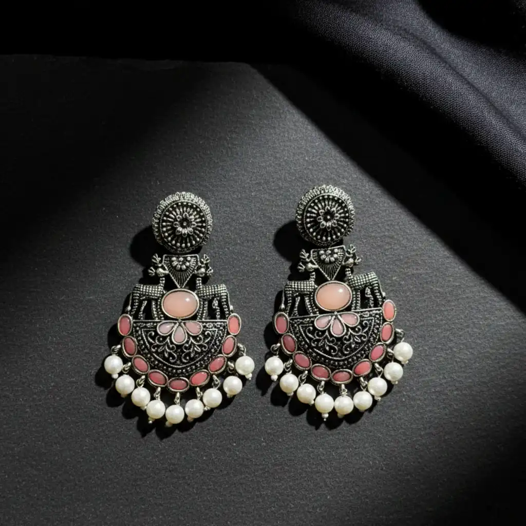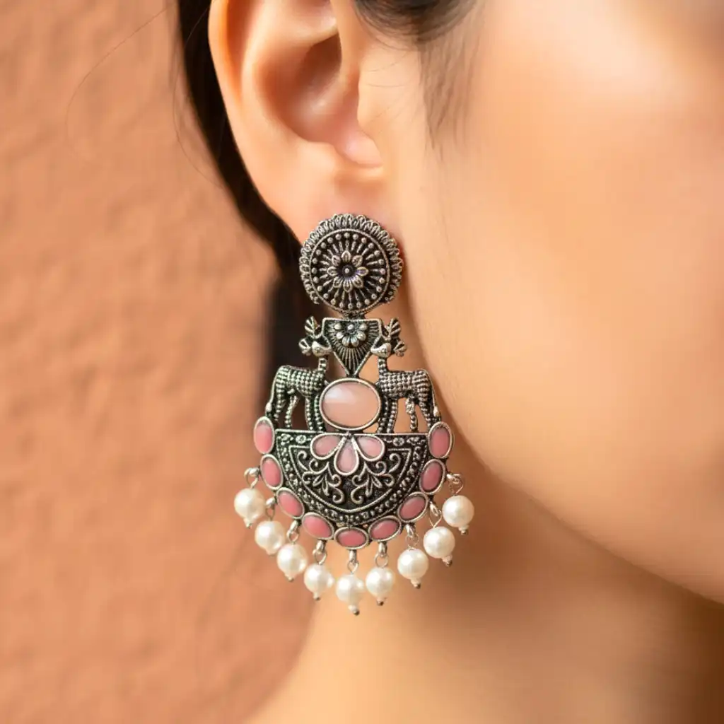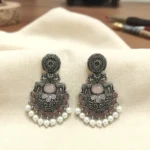 These beautifully handcrafted statement chandbalis feature intricate oxidised detailing, delicate carvings, and traditional motifs. The design is enhanced with soft pastel stones and elegant pearl drops at the bottom, creating a perfect blend of vintage charm and festive grace. Lightweight yet bold, these earrings are designed to effortlessly elevate both ethnic and fusion looks. The size is slightly different from the picture, just a minute difference.