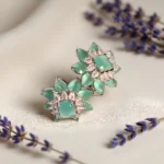 The freshness of spring blooms inspires the Blossom Grace Earrings. With pastel petals surrounded by a halo of shimmering American Diamonds, these earrings balance subtle elegance with a sparkling finish. Their floral charm adds a youthful yet sophisticated vibe to any festive look.