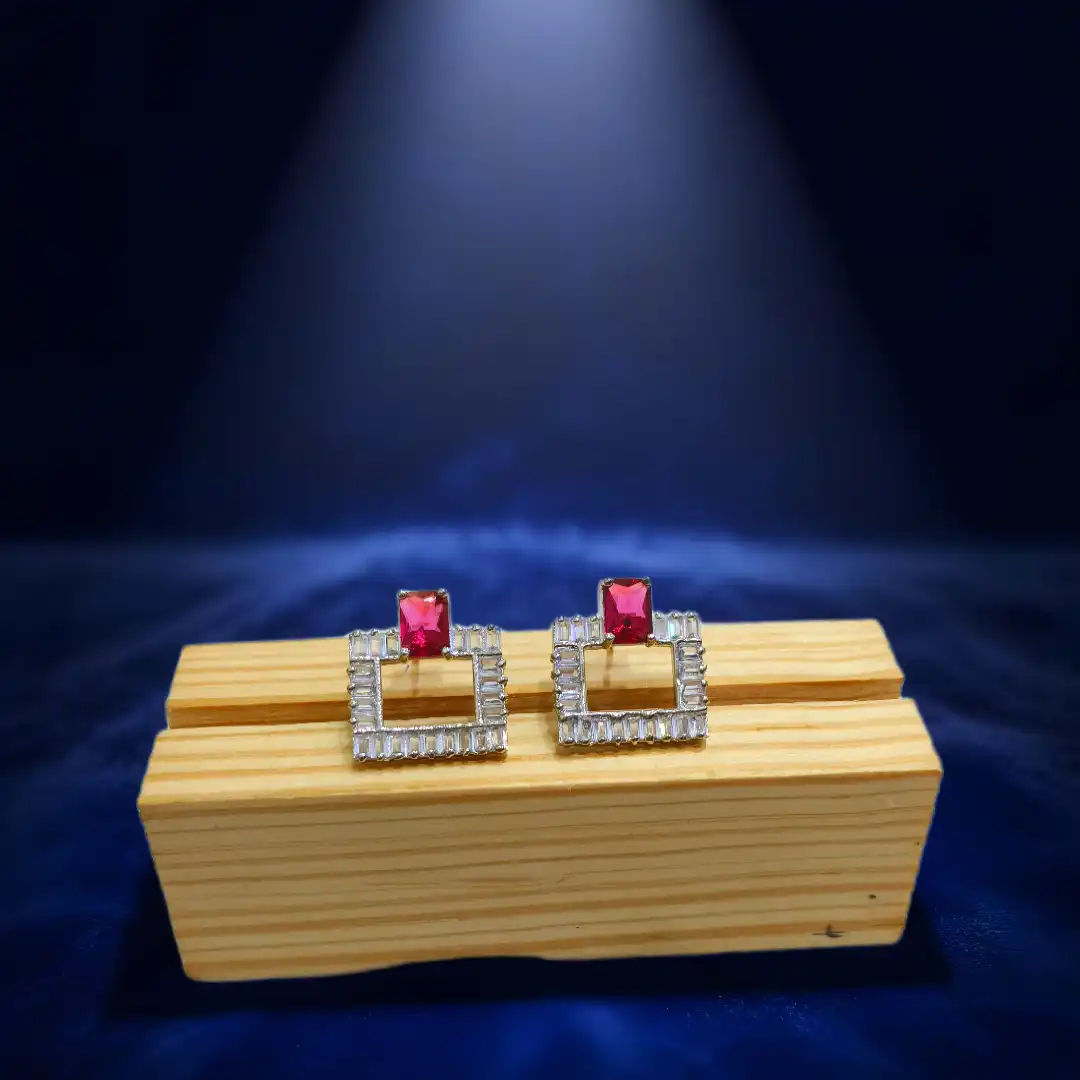 Glimmer Frames are a modern take on statement studs. Featuring a sharp geometric square silhouette bordered with sparkling American Diamonds, these earrings highlight a stone at the center that adds a touch of softness to the bold design. Their balance of shimmer and structure makes them versatile for both festive and western outfits.