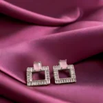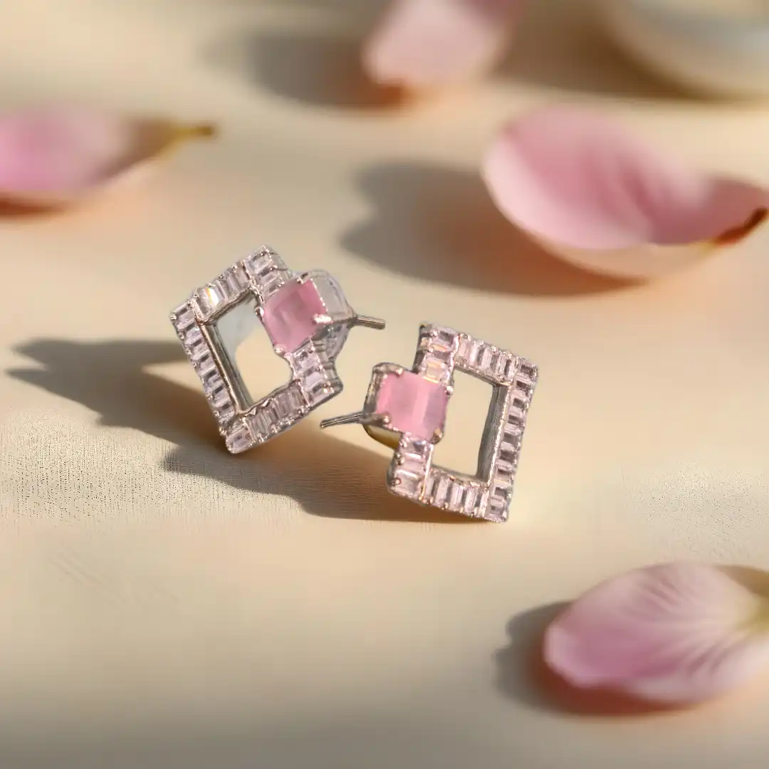 Glimmer Frames are a modern take on statement studs. Featuring a sharp geometric square silhouette bordered with sparkling American Diamonds, these earrings highlight a stone at the center that adds a touch of softness to the bold design. Their balance of shimmer and structure makes them versatile for both festive and western outfits.