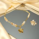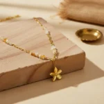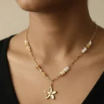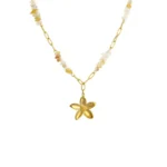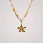 The ALINA FLORAL NECKLACE is a delicate celebration of femininity and warmth. Designed with a beautifully polished five-petal floral pendant, this necklace radiates a soft golden glow that feels both elegant and effortless. The subtle ivory and honey-toned natural stone beads add an earthy charm, creating a perfect balance between modern minimalism and timeless grace.