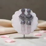 A timeless tribute to Indian tradition, the Antique Jhumka Drops are exquisitely crafted with peacock-inspired motifs and vibrant pink and green stone accents. The top features an engraved bird design symbolizing grace and beauty, while the dome-shaped jhumkas showcase intricate carvings and pearl danglings. The oxidised silver finish lends a rustic vintage vibe that instantly elevates ethnic ensembles.