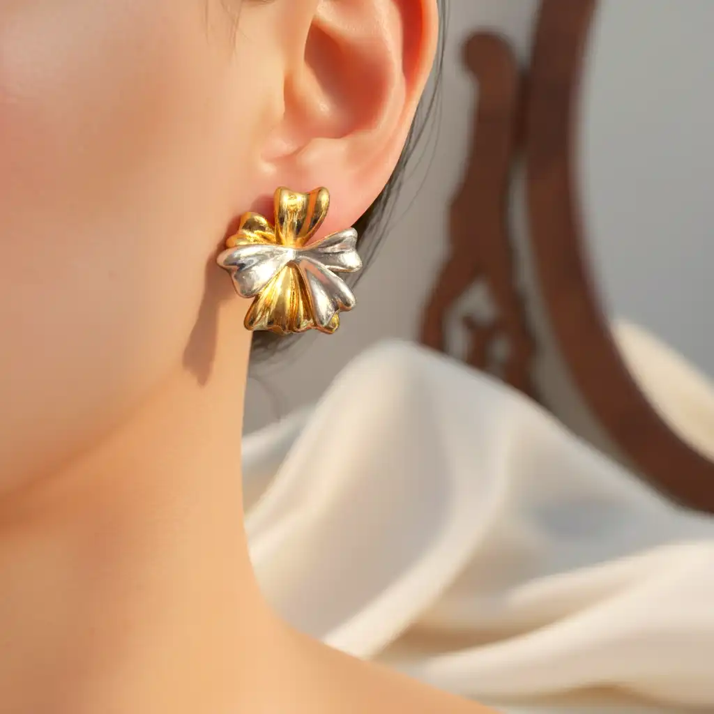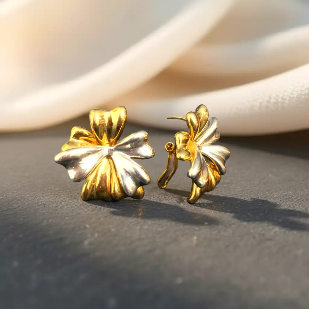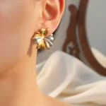Meet the Aurora Bloom Studs, designed in an elegant floral silhouette with a high-shine 18k gold-plated finish. These statement studs have a molten, sculpted texture that reflects light beautifully, giving your look a luxurious glow. Lightweight yet bold, they sit comfortably on the ears while adding instant sophistication.
