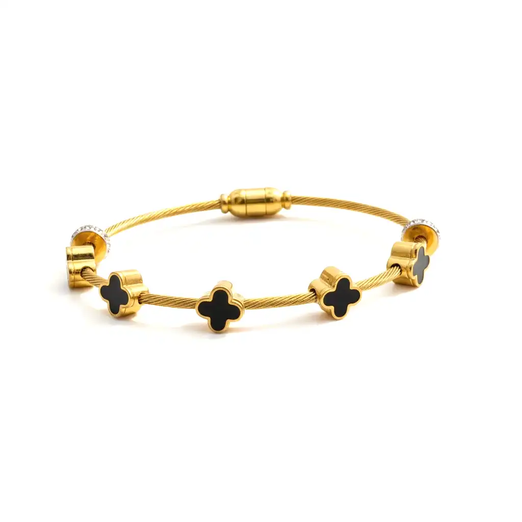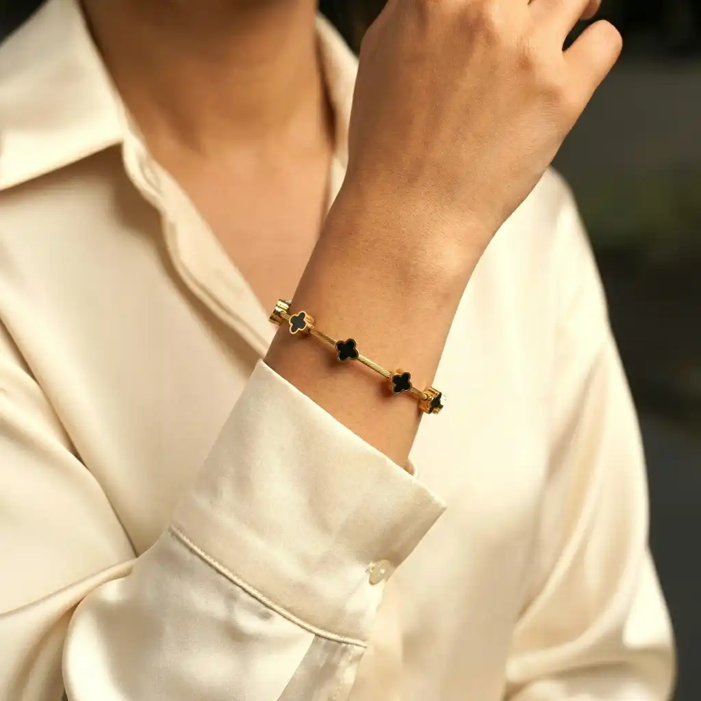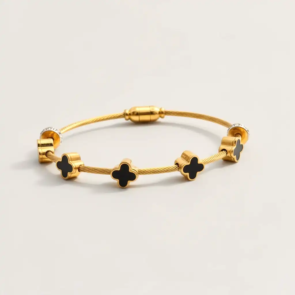The Bossbloom Bracelet is where elegance meets edge. Featuring luxe black floral charms on a golden twisted cable base, this bracelet is bold, structured, and powerfully feminine, made for boss babes who bloom in every season.