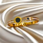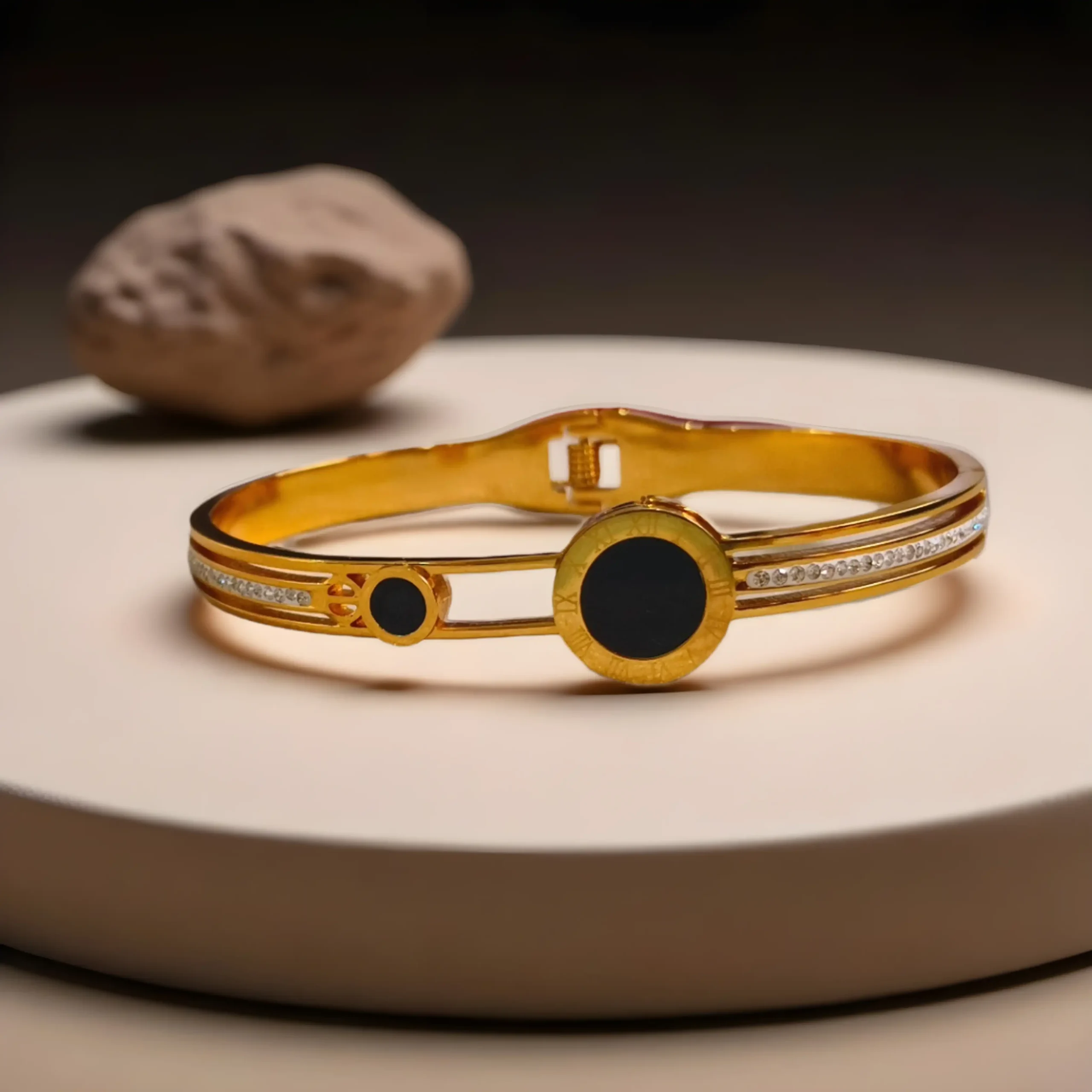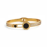The Classic Black Dial Cuff Bracelet is the definition of modern elegance. Designed with a sleek gold-plated frame, it features striking black enamel accents and a line of delicate cubic stones that add just the right amount of sparkle. The bold circular motifs bring a touch of luxury and timeless sophistication, making it a perfect pick for both day and evening wear.