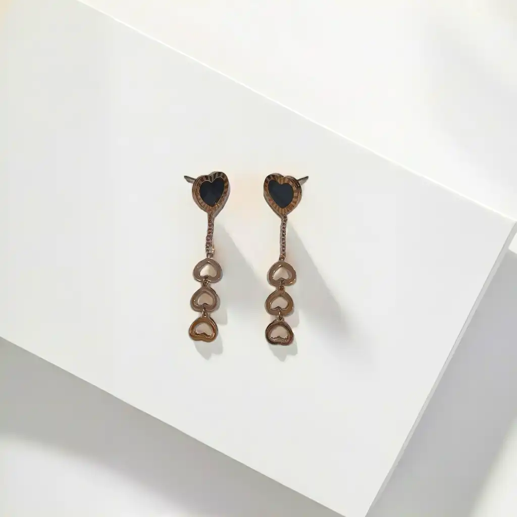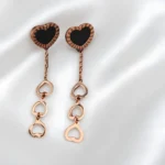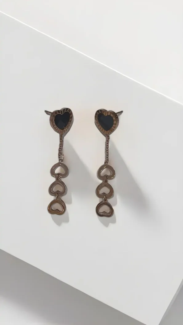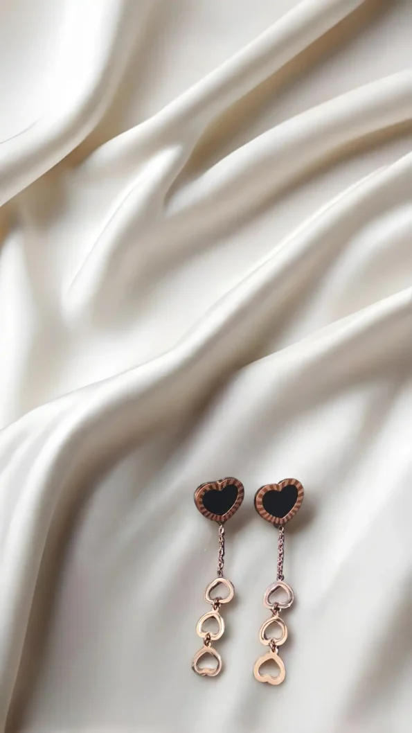 Fall in love at first sight with our Crush Connection Earrings, a romantic blend of modern charm and timeless elegance. These asymmetrical earrings feature glossy black heart studs framed with a delicate rose-gold striped rim. One side adds drama with a cascading trio of mini open-heart charms, symbolizing connection, emotion, and flow. Crafted from premium-quality alloy and polished with a luxurious rose gold-tone finish, these earrings are lightweight, skin-friendly, and eye-catching. Whether it’s a first date or a girl’s night out, these hearts speak the language of fashion and love.