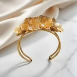 A garden in full bloom, this wide cuff bracelet is adorned with large sculpted flowers and sparkling rhinestone centers. It radiates elegance and rustic charm all at once.