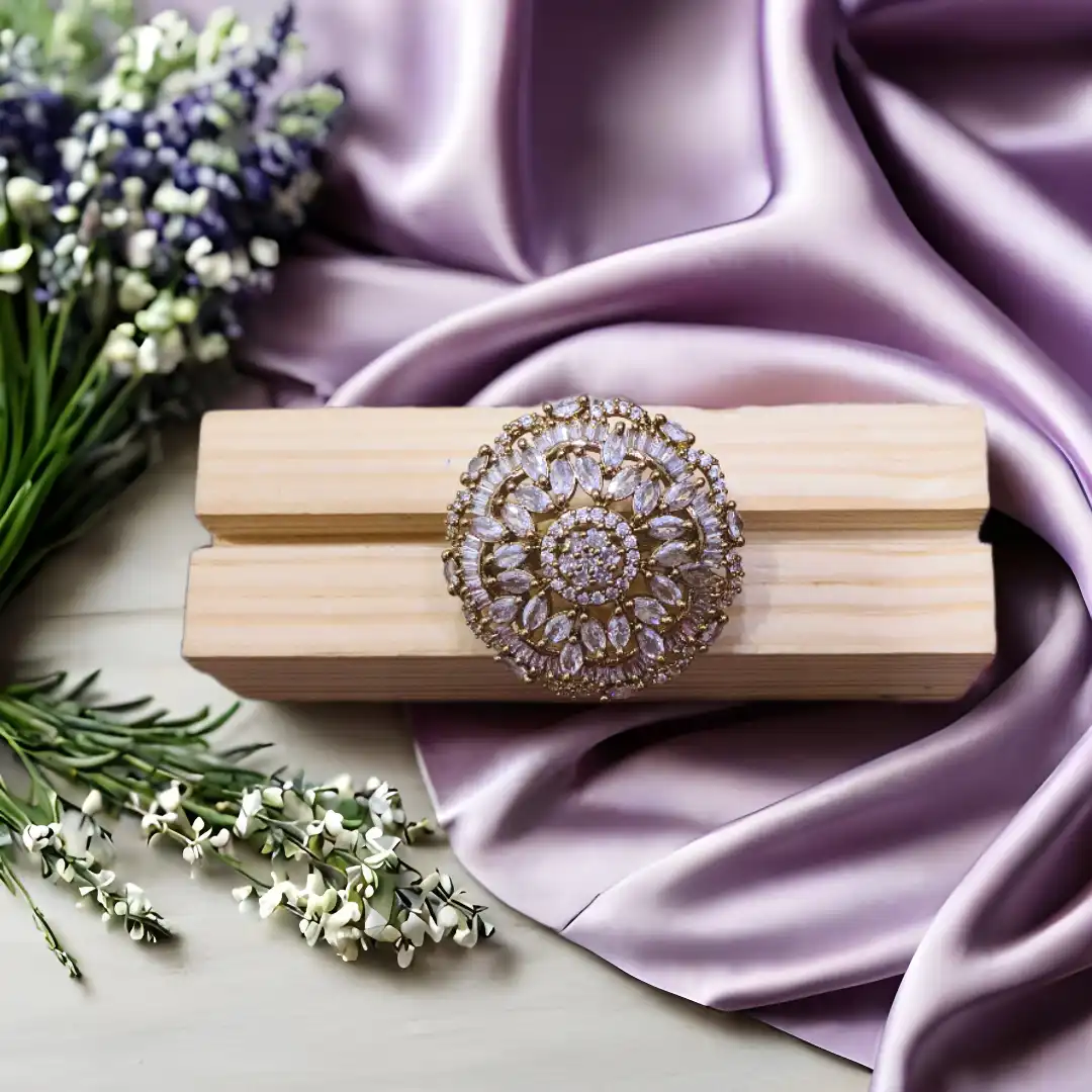 Bold and breathtaking, the Dazzle AD Disc Ring is designed like a shimmering galaxy on your finger. With concentric layers of finely set American Diamonds forming a round disc, it creates a glowing brilliance that stands out in every gathering. This statement piece ensures your hand will never go unnoticed.
