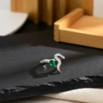 An elegant open-style ring featuring shimmering white zircon-studded curves embracing a striking emerald green pear-cut stone at the center. Its graceful silhouette gives a soft butterfly/leaf-inspired look, blending modern sophistication with delicate charm.