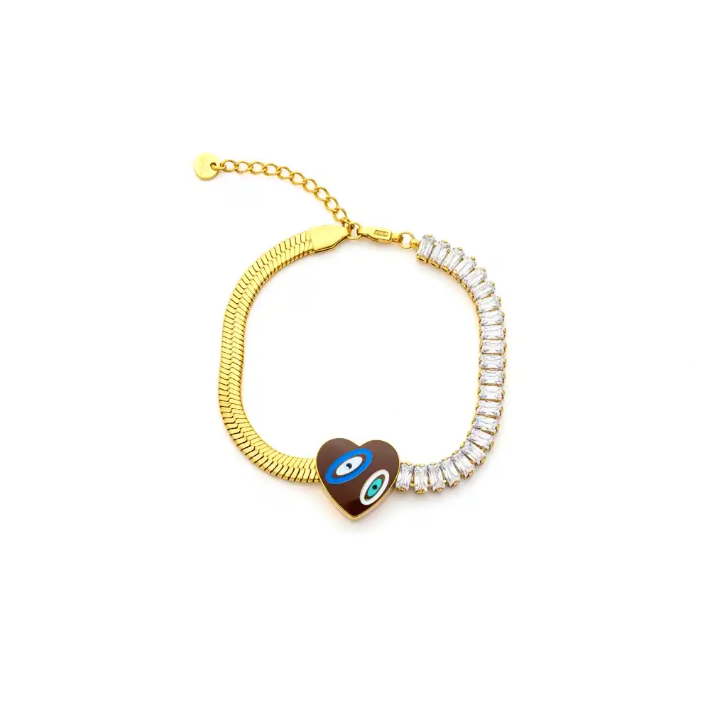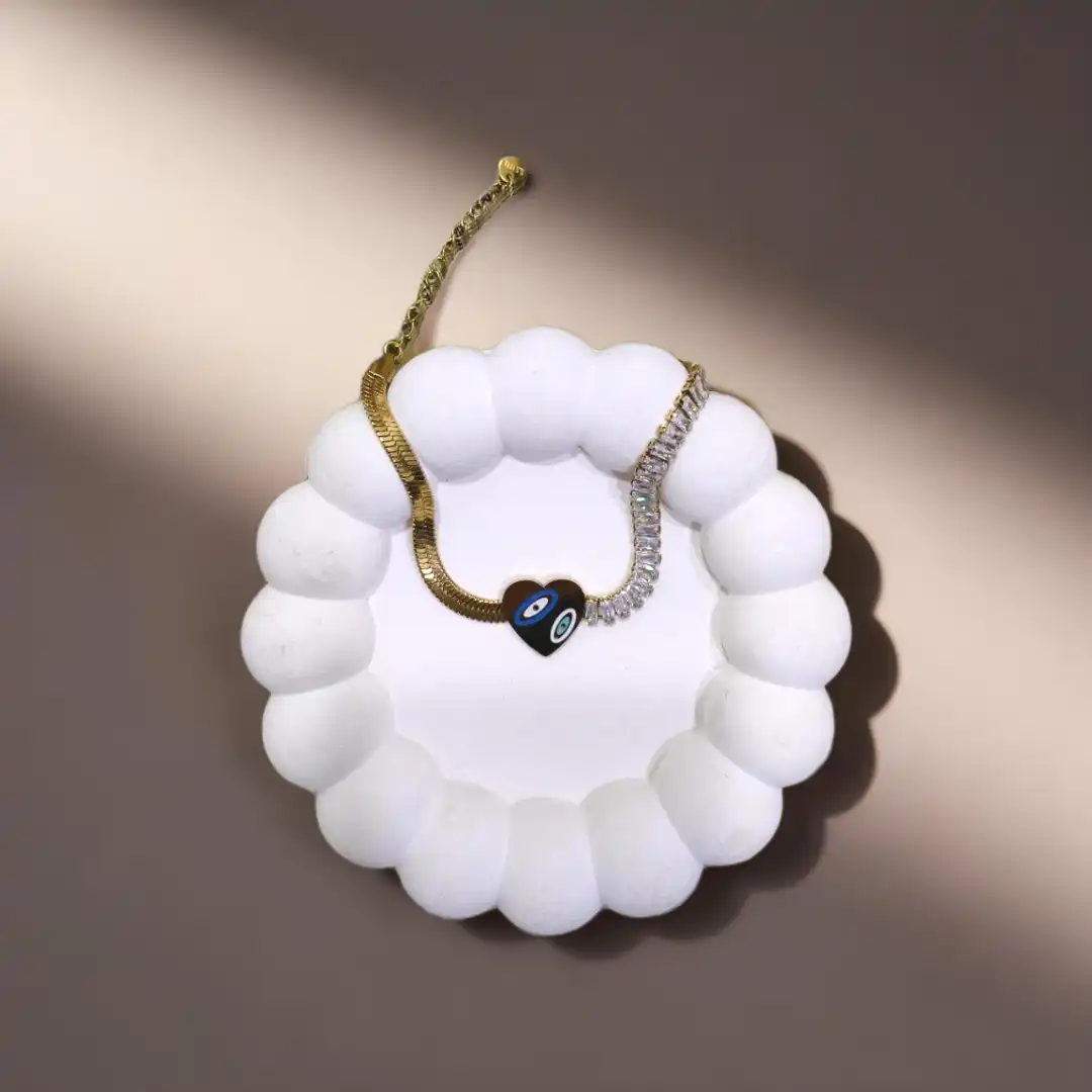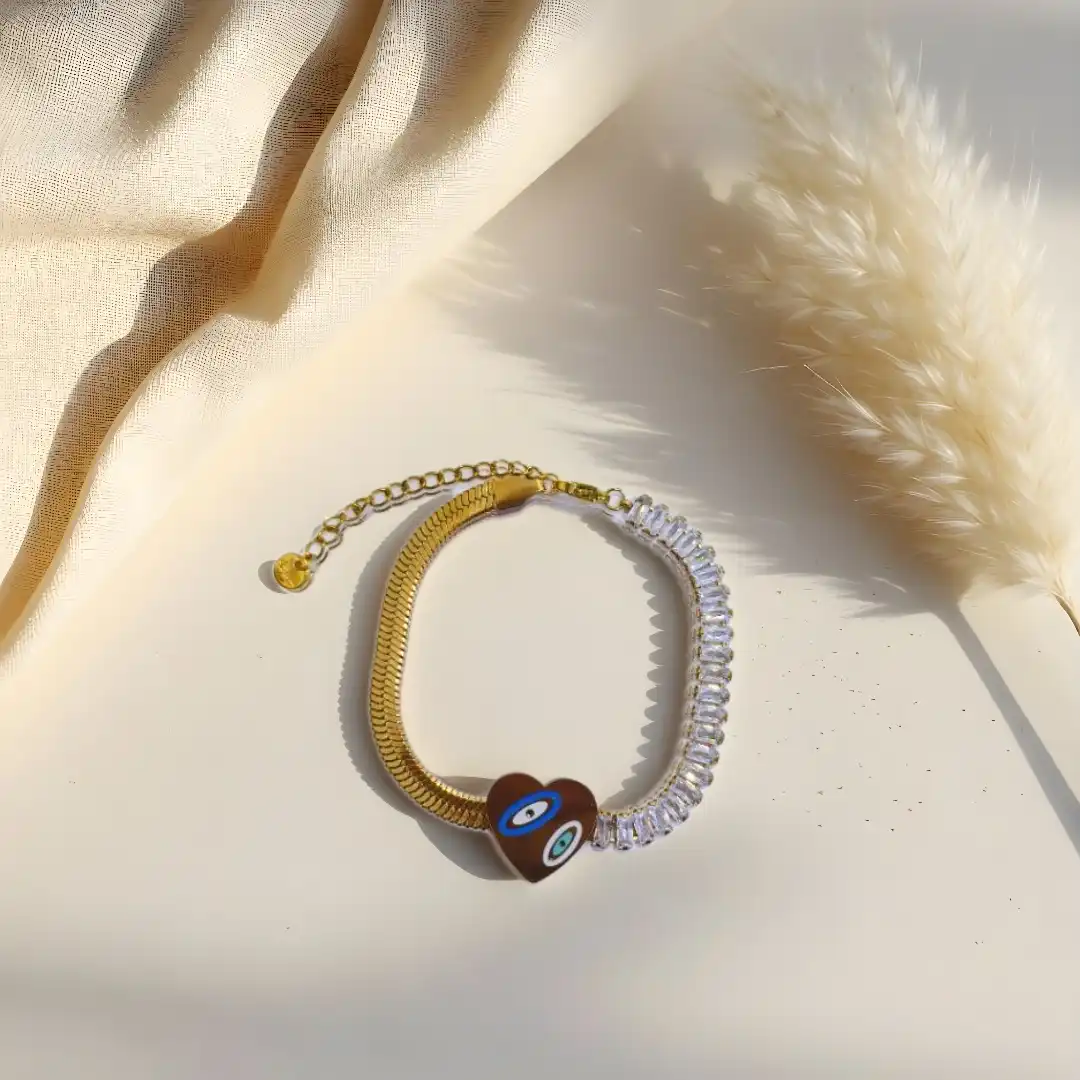 A striking bracelet that combines sleek spiral design with sparkling crystal detailing. It’s an anti-tarnish golden finish that shines with modern elegance, while the playful center charm adds an artistic touch. Perfect for those who like jewelry that feels unique, chic, and luxurious.