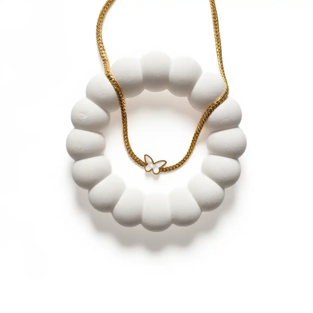 Color: Rich gold-tone chain paired with a white pearl-like butterfly pendant, adding a chic and elegant contrast.