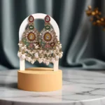 The Heer Chandbali earrings are a royal masterpiece, designed for brides and women who love grandeur. With kundan work, colorful stones, and pearl droplets, these chandbalis exude unmatched opulence and traditional beauty.