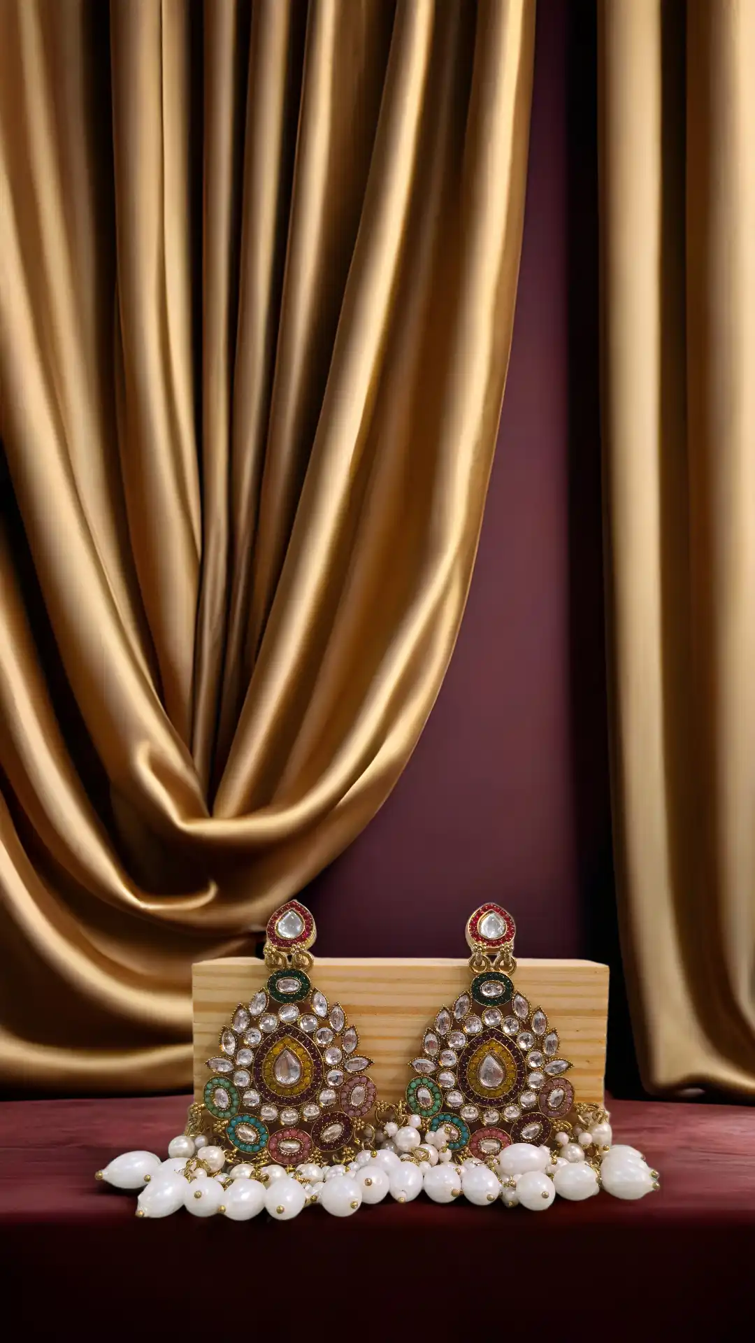 Color: Golden base with white pearls, green, pink, and multicolor kundan accents.