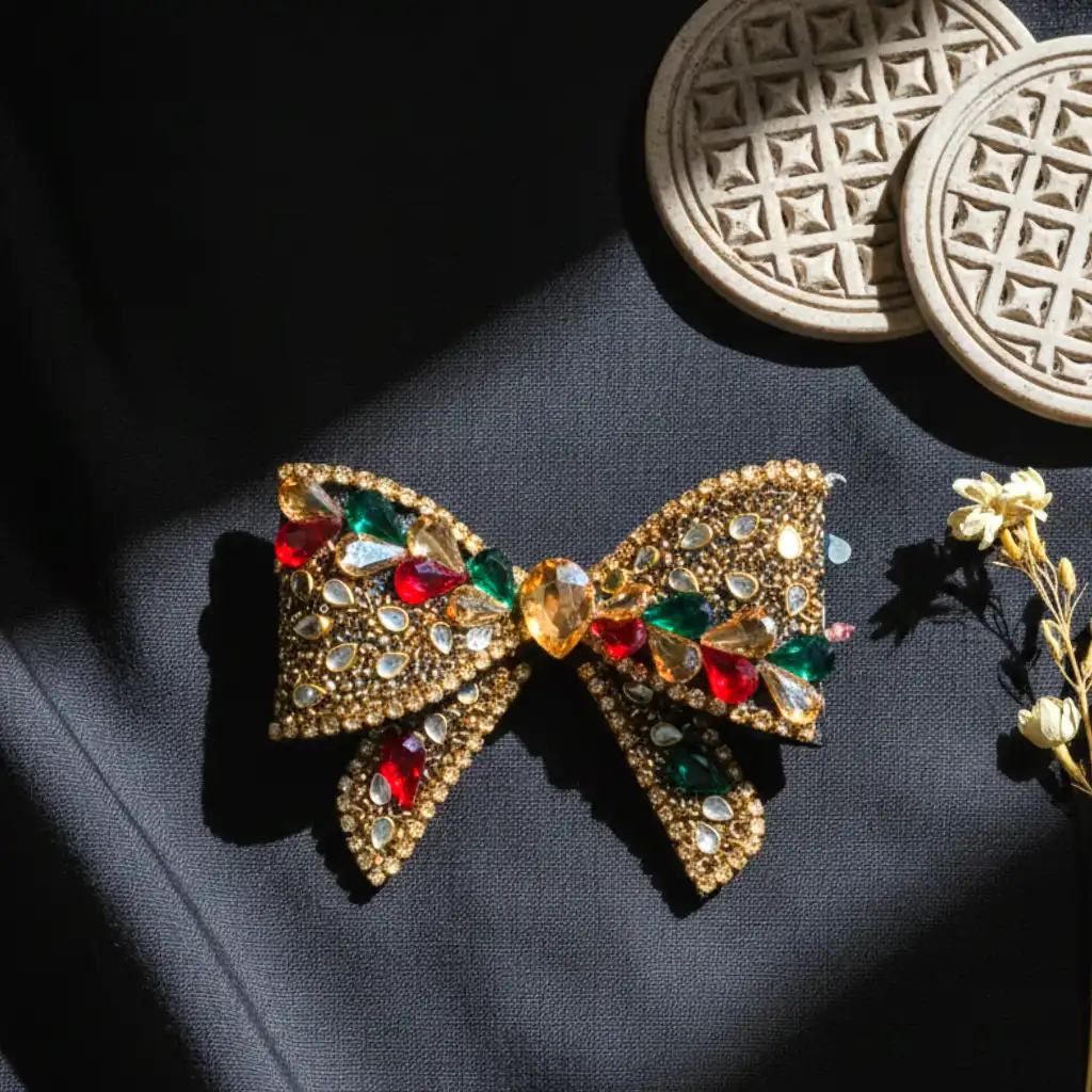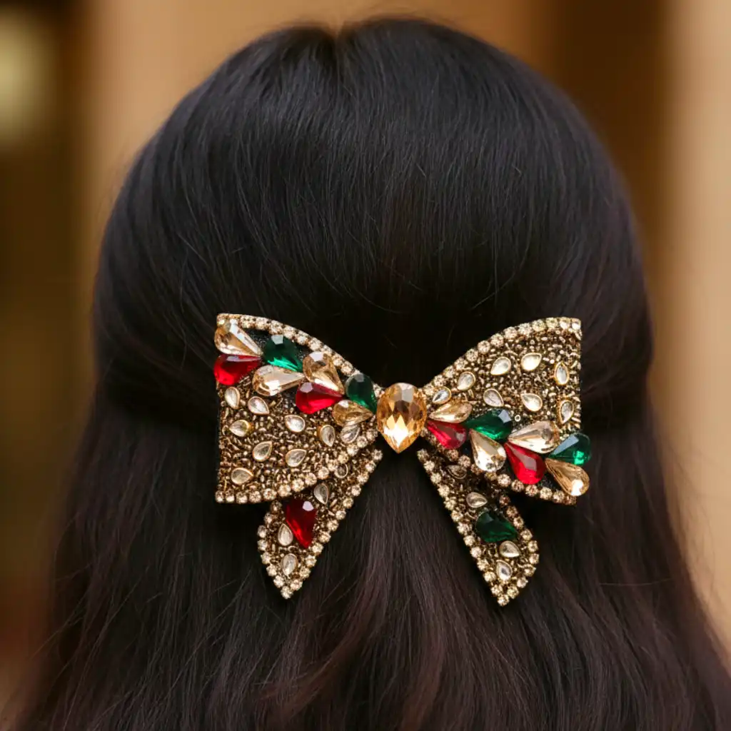 Styling Tips: Style the Jewel Symphony Bow with a half-up hairstyle, soft curls, or a sleek low ponytail to let the bow stand out. It pairs beautifully with festive outfits, lehengas, sarees, or elegant evening dresses, making it perfect for weddings, parties, and special occasions.
