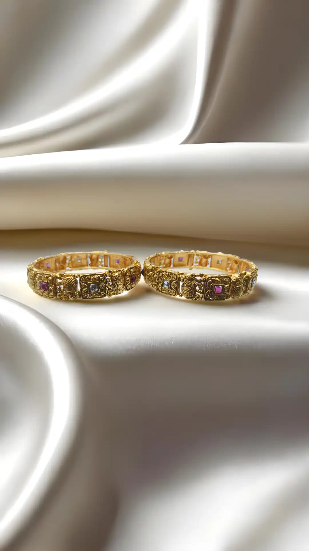 Antique gold kada with temple-style motifs and ruby-white stone detailing ? timeless and traditional.