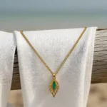 The Leafline Necklace is a graceful piece that celebrates nature’s elegance through fine artistry. Crafted in radiant anti-tarnish gold plating, the pendant takes the form of a delicate leaf, featuring a stunning emerald-green marquise stone at its center, surrounded by shimmering white cubic zirconia crystals that add brilliance and depth. The gold-toned chain complements the pendant, giving it a refined, luxurious look. This necklace embodies timeless beauty, ideal for both everyday elegance and special occasions.