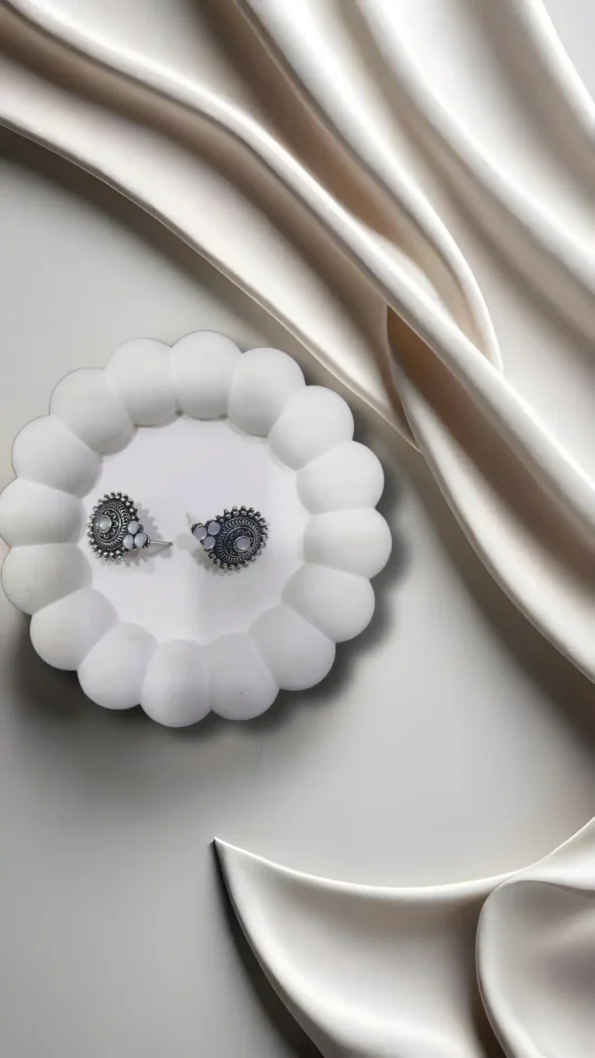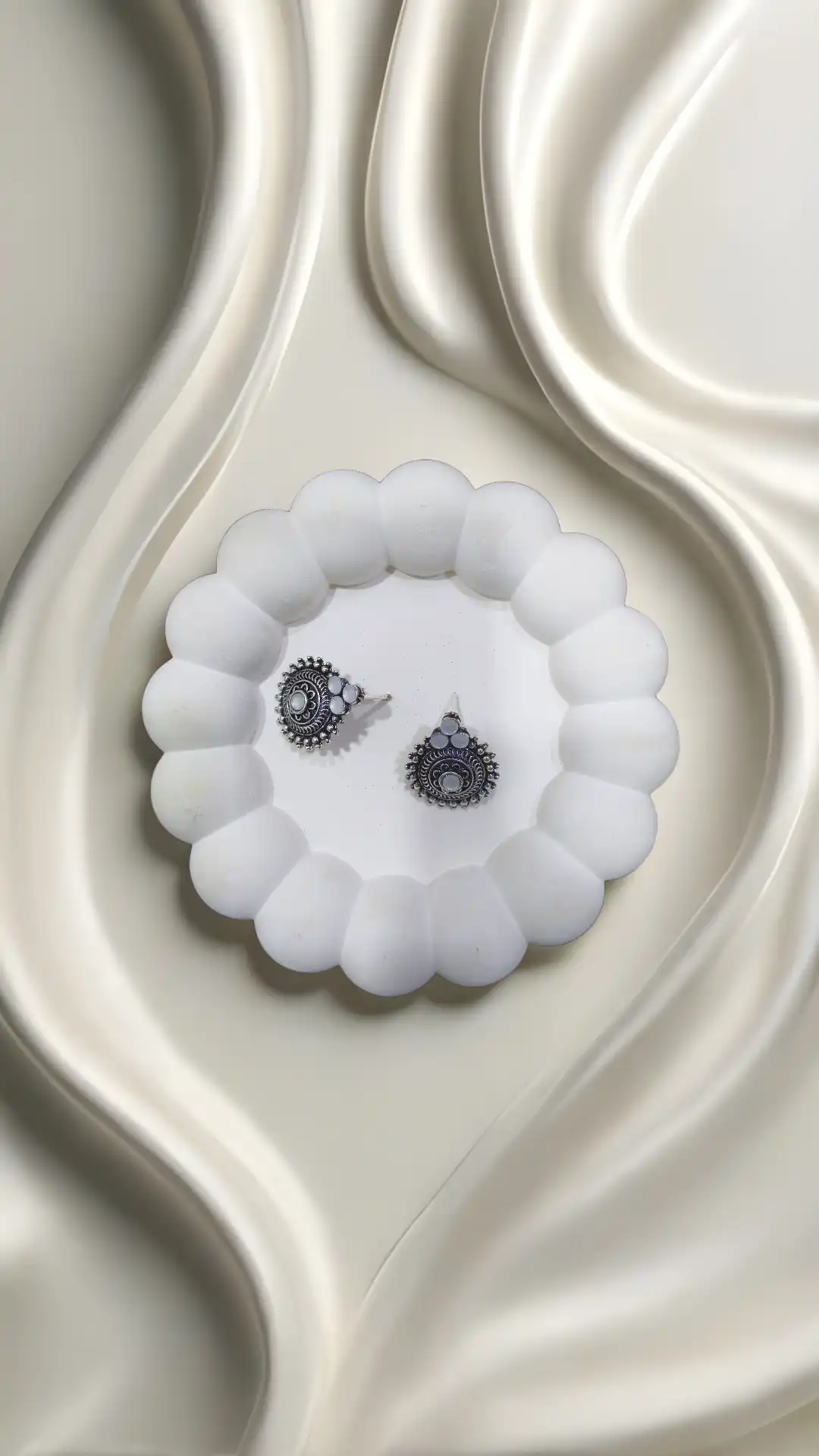 Rooted in traditional Indian aesthetics, the Mini Mandala Studs combine the serene symmetry of mandala art with the rustic charm of oxidized metal. The earrings feature a finely detailed circular motif symbolizing harmony and balance, delicately bordered with petite white beads that lend an ethereal touch. Compact yet statement-worthy, these studs are your go-to piece for effortless ethnic elegance.