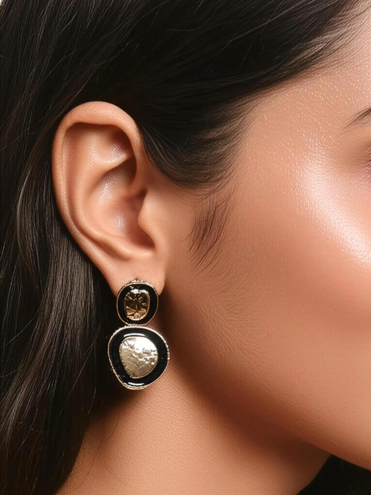 Bold meets elegance in these uniquely sculpted midnight molten Drops. Featuring a hammered metallic texture encased in a glossy black enamel border, these dual-layered statement studs bring a perfect balance of modern artistry and timeless charm. The abstract organic shape adds a raw, earthy edge. Making them ideal for fashion-forward souls who love to stand out.