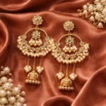 These statement chandbali earrings showcase intricate craftsmanship with delicate floral elements and graceful pearl clusters. The elegant arch design is adorned with shimmering stones, while the cascading pearls and miniature jhumki drops add beautiful movement. Perfect for festive occasions, these earrings bring a regal charm that instantly elevates any traditional look.