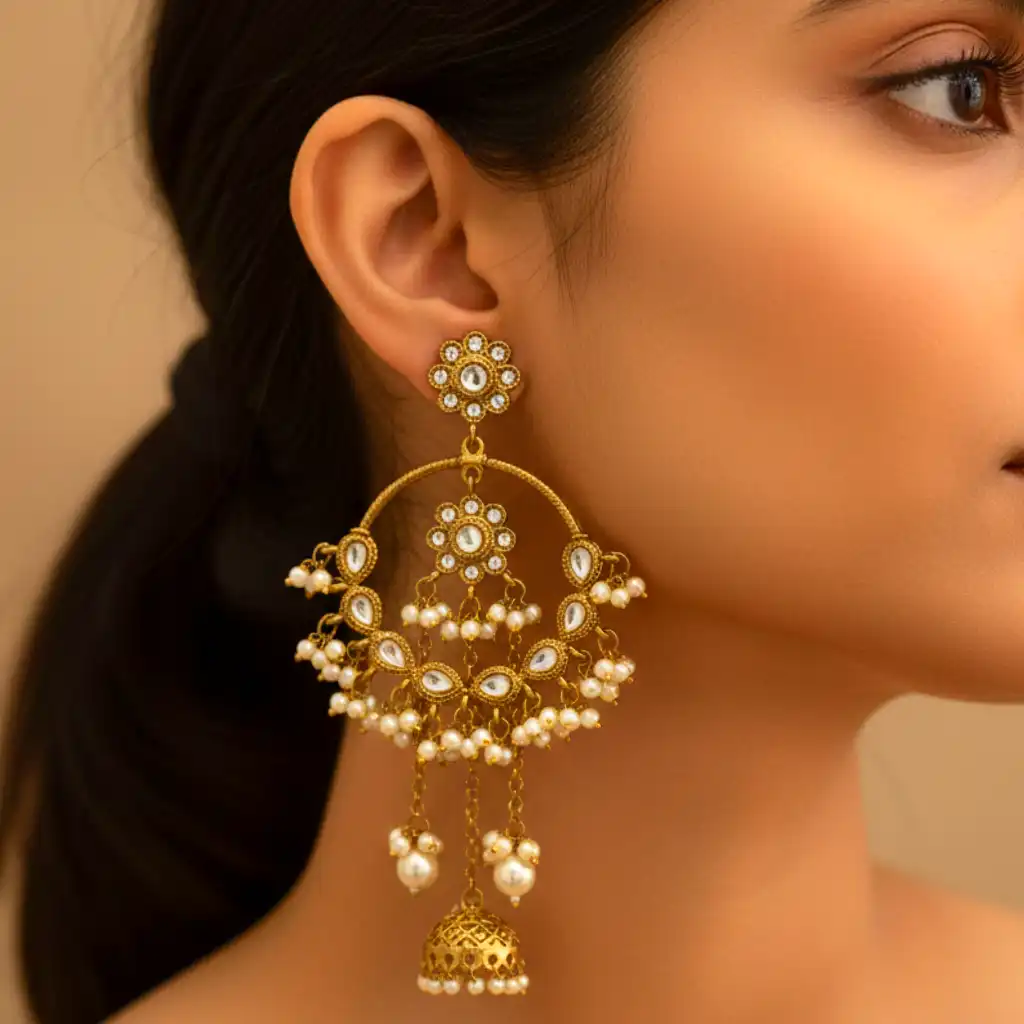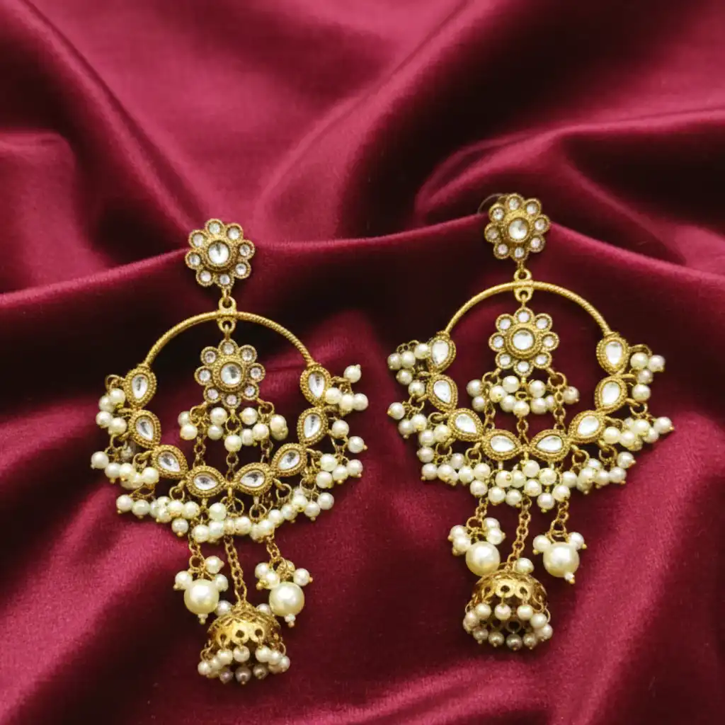 Material & Color: Made with premium alloy metal with premium plating, these earrings feature kundan-style stones and artificial pearl bead embellishments. The rich antique gold tone, combined with soft ivory pearl,s gives them a luxurious and timeless appearance.