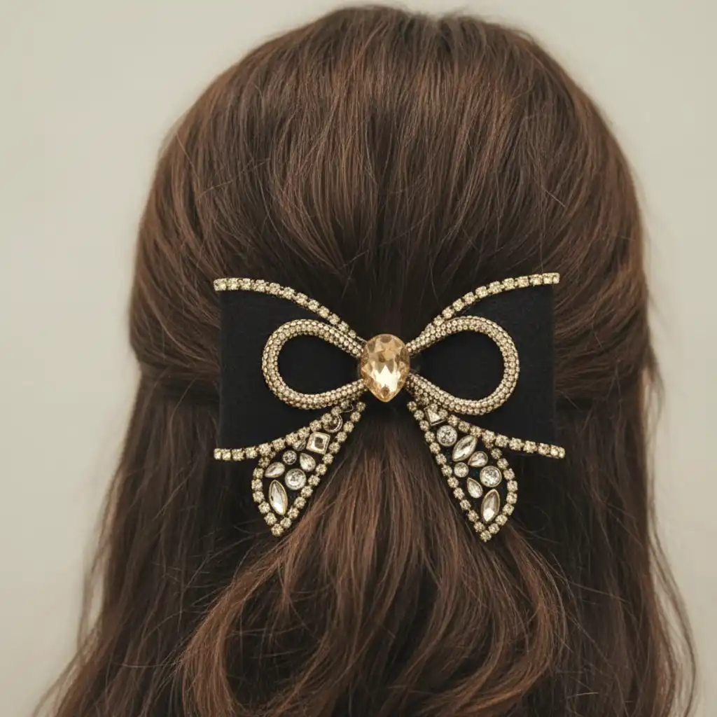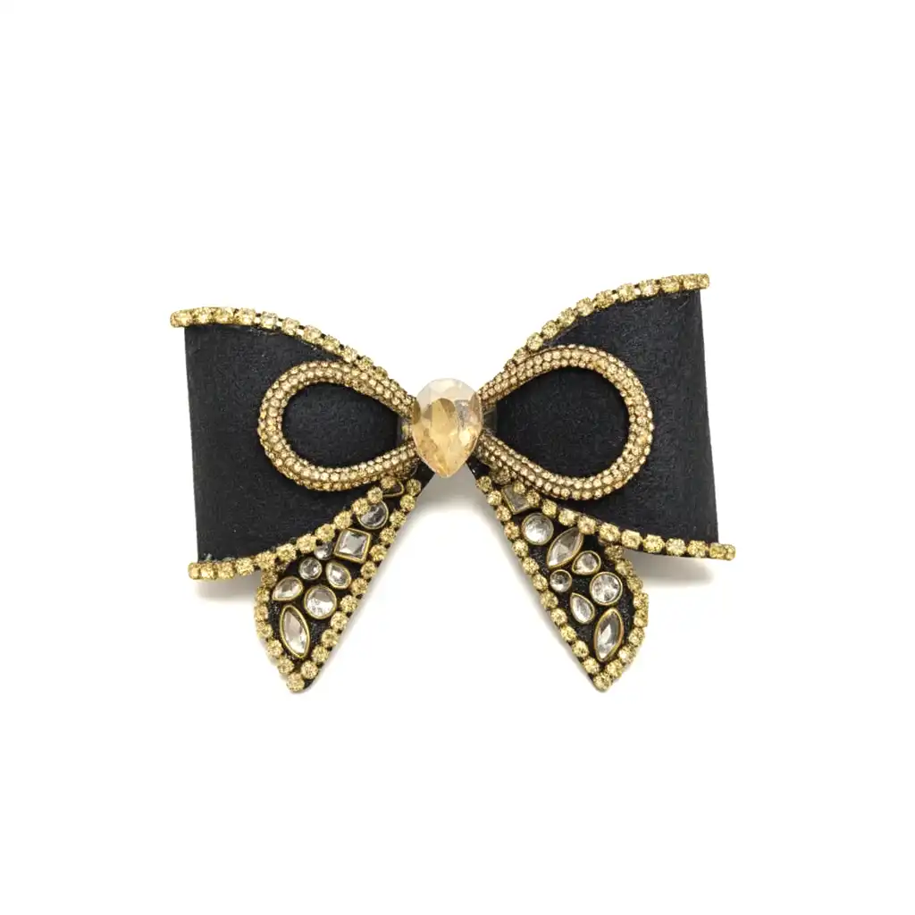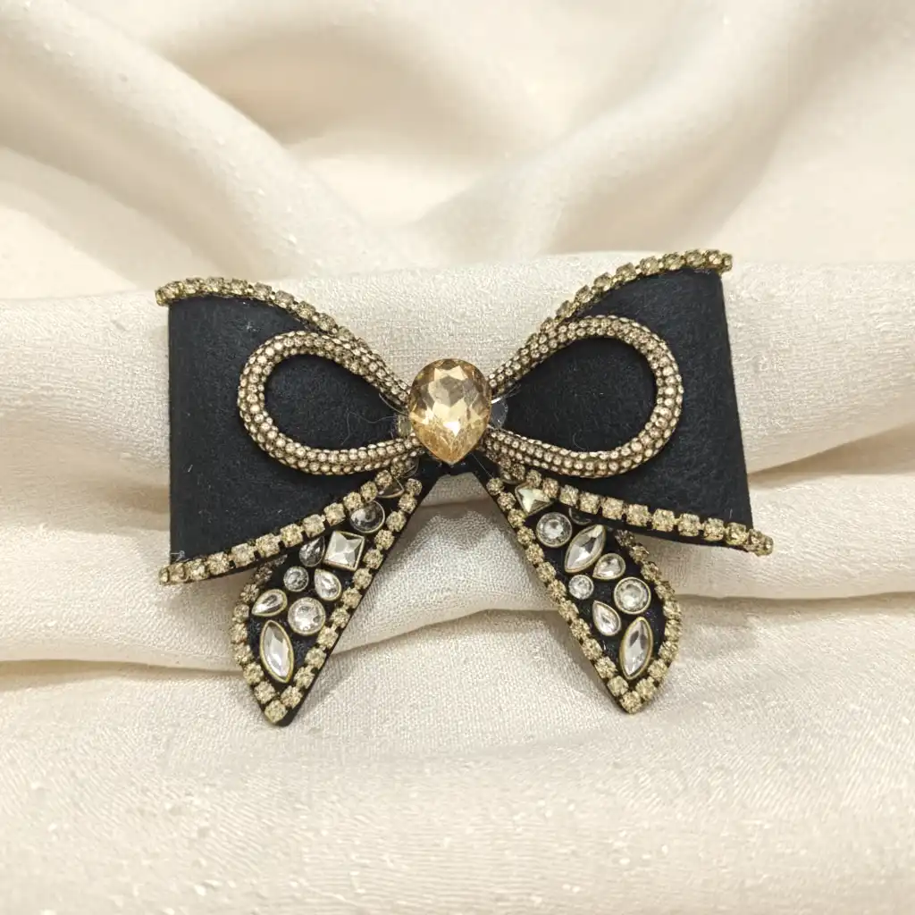 Material & Color: Crafted with a premium black fabric bow with a plastic and gold-tone anti-tarnish alloy detailing, adorned with champagne and clear crystal stones that add a subtle sparkle.