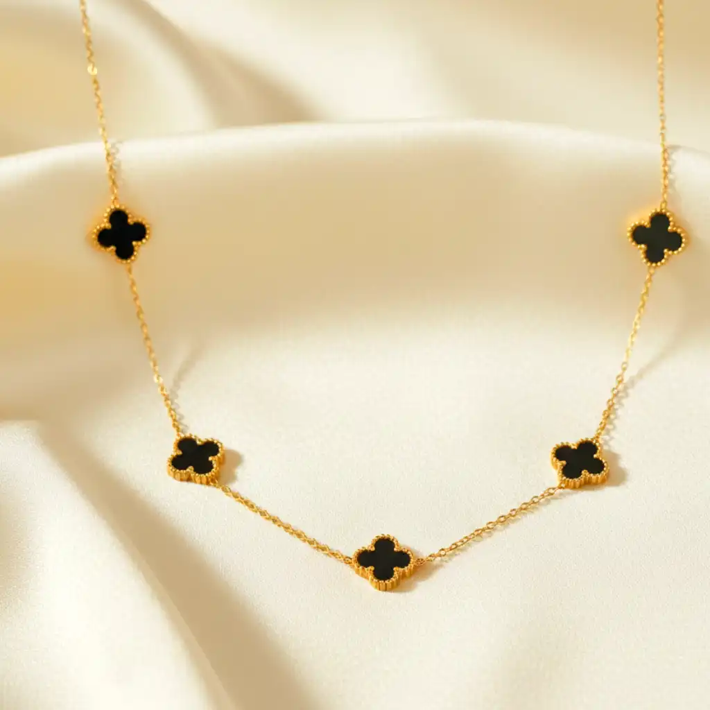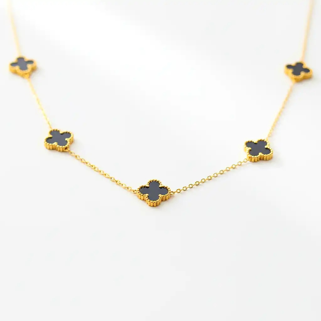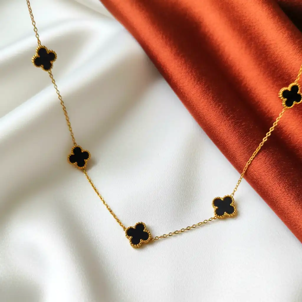 Material & Color: Crafted from high-quality alloy with anti-tarnish plating, this necklace showcases a radiant golden chain paired with deep black enamel clover motifs. The contrast of black and gold gives it a classy, iconic, and high-end finish.