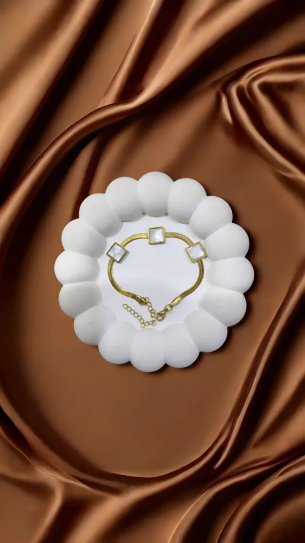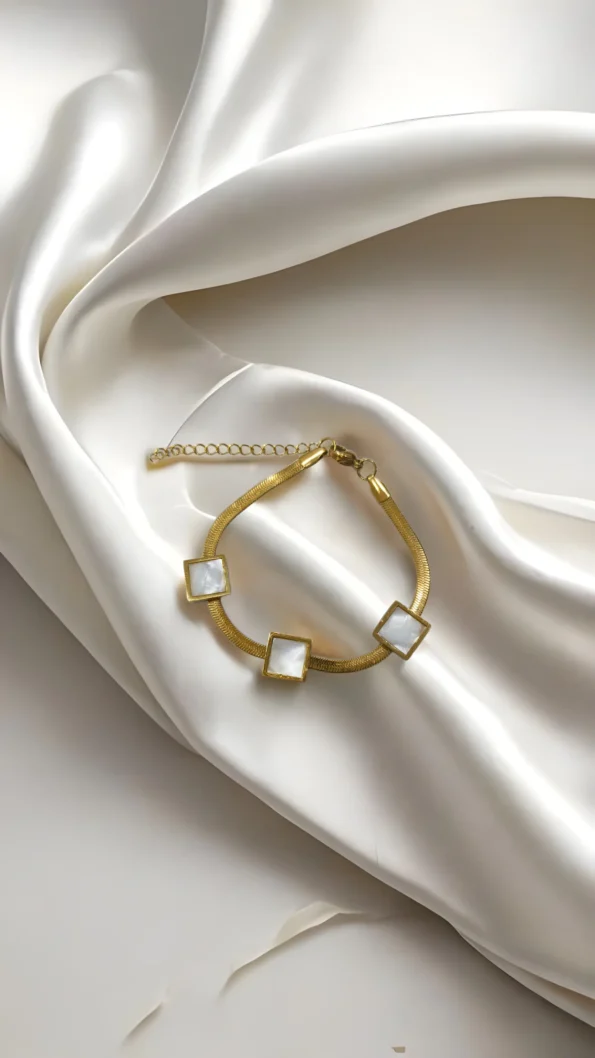 A soft gold chain bracelet with square shell charms is subtle, aesthetic, and modern minimalist.