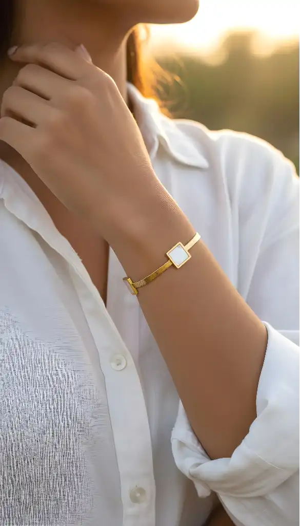 Product Description: The Noor Bracelet radiates softness and glow, combining matte gold with square-cut shell inlays. Clean, luxurious, and full of subtle charm.Color: Matte Gold Material: Stainless steel with anti-tarnish & shell accents Size: Adjustable Perfect For: Office wear, sophisticated gifting, or minimalist fashion lovers. Styling Tip: Pair with pearl studs or gold hoops. Matches beautifully with linen outfits. |