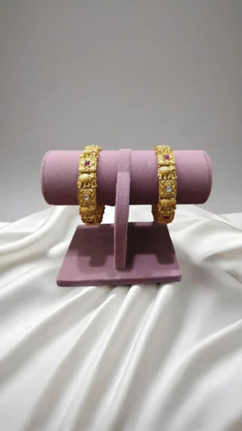 The Pastel Elegance Bangles are designed for those who adore subtle hues blended with timeless tradition. These bangles feature soft pastel stones placed in a sleek linear setting, bordered with textured gold detailing that enhances their elegance. The pastel tones make them versatile, while the golden frame ensures a festive finish.