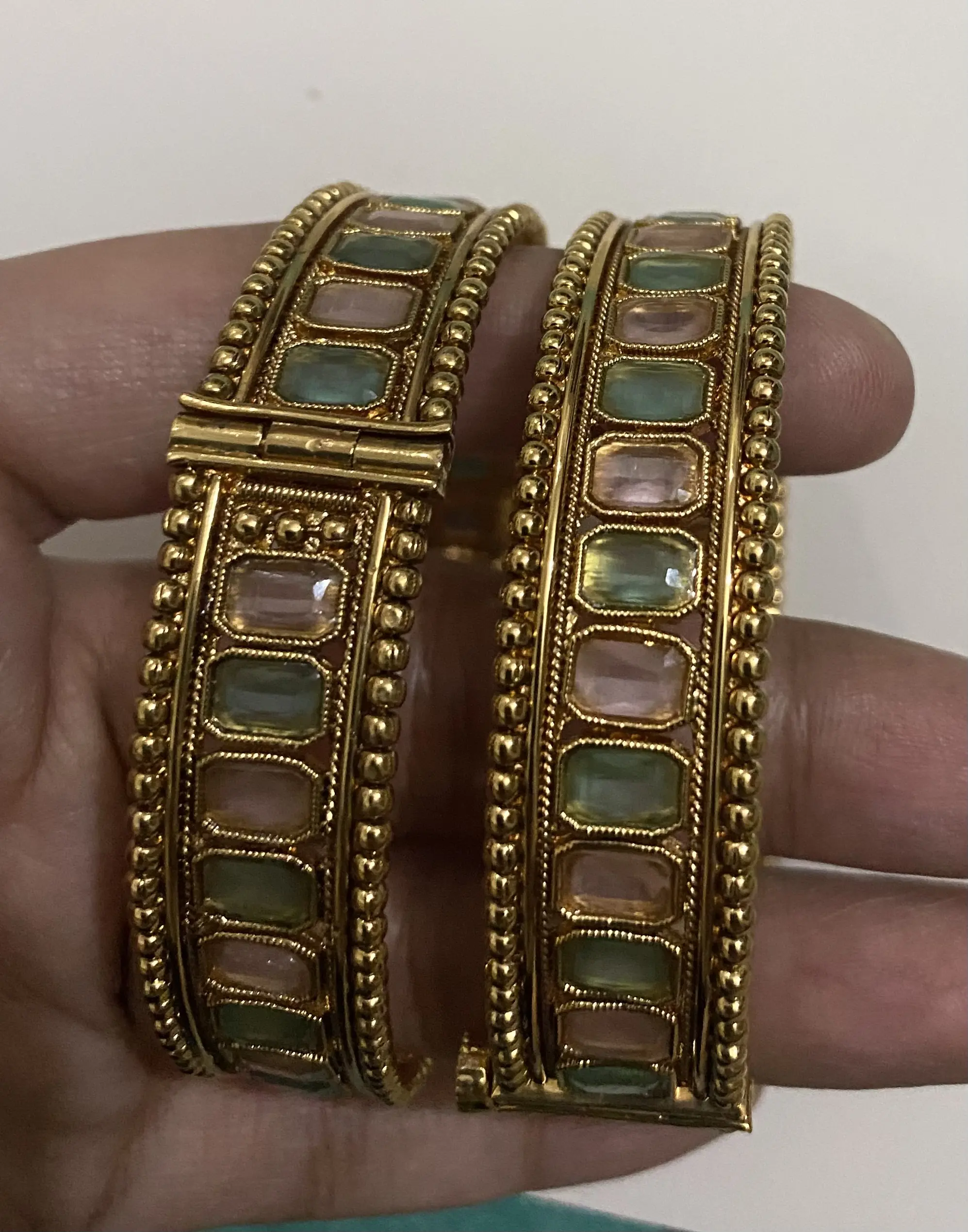 Classic gold bangles set with pastel pink and mint green squares, blending subtle tones with timeless design.