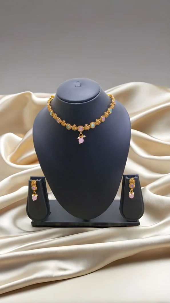 A majestic bridal choker set with pink accents, intricate detailing, and matching earrings perfect for traditional celebrations.