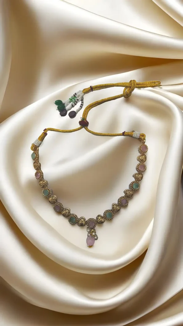 Description: This stunning choker is a celebration of handcrafted tradition with a fresh pastel twist. Decorated with antique coin motifs, colorful enamel beads, and threaded ghungroo charms, it speaks of heritage, culture, and bold expression. The adjustable yellow dori adds a vibrant finish that makes it stand out at every festive event.
