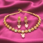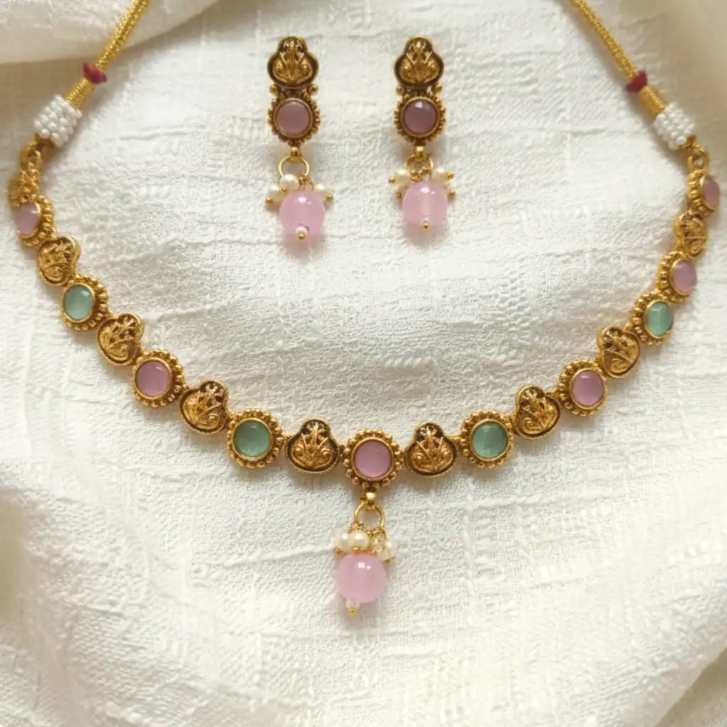 This stunning choker is a celebration of handcrafted tradition with a fresh pastel twist. Decorated with antique coin motifs, colorful enamel beads, and threaded ghungroo charms, it speaks of heritage, culture, and bold expression. The adjustable yellow dori adds a vibrant finish that makes it stand out at every festive event.