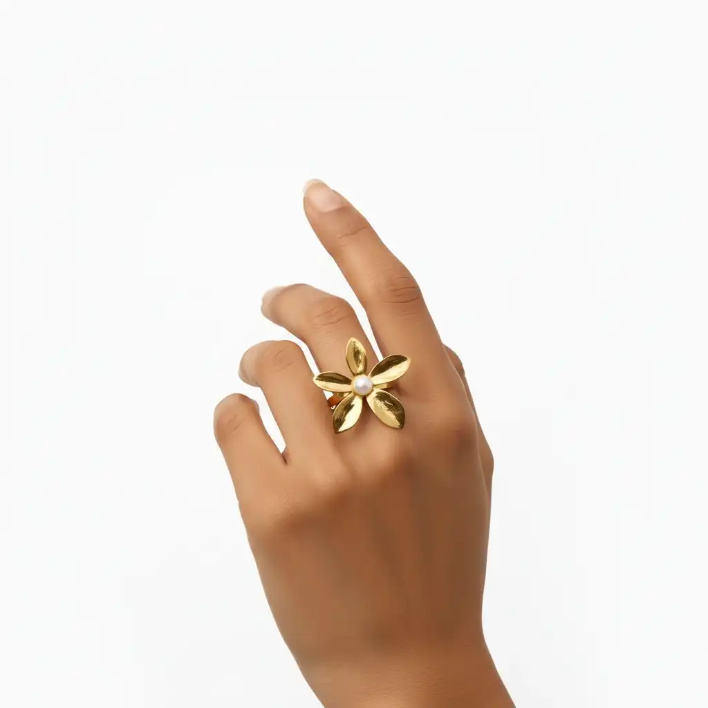 Turn heads with our Pearled Radiance Ring, a modern statement piece that blends minimal elegance with bold charm. Crafted from premium brass and finished in a radiant ANTI-TARNISH gold polish, it features five sculpted petals surrounding a luminous faux pearl — giving off luxe, high-fashion energy. The adjustable size ensures it fits comfortably while adding instant sophistication to your look.