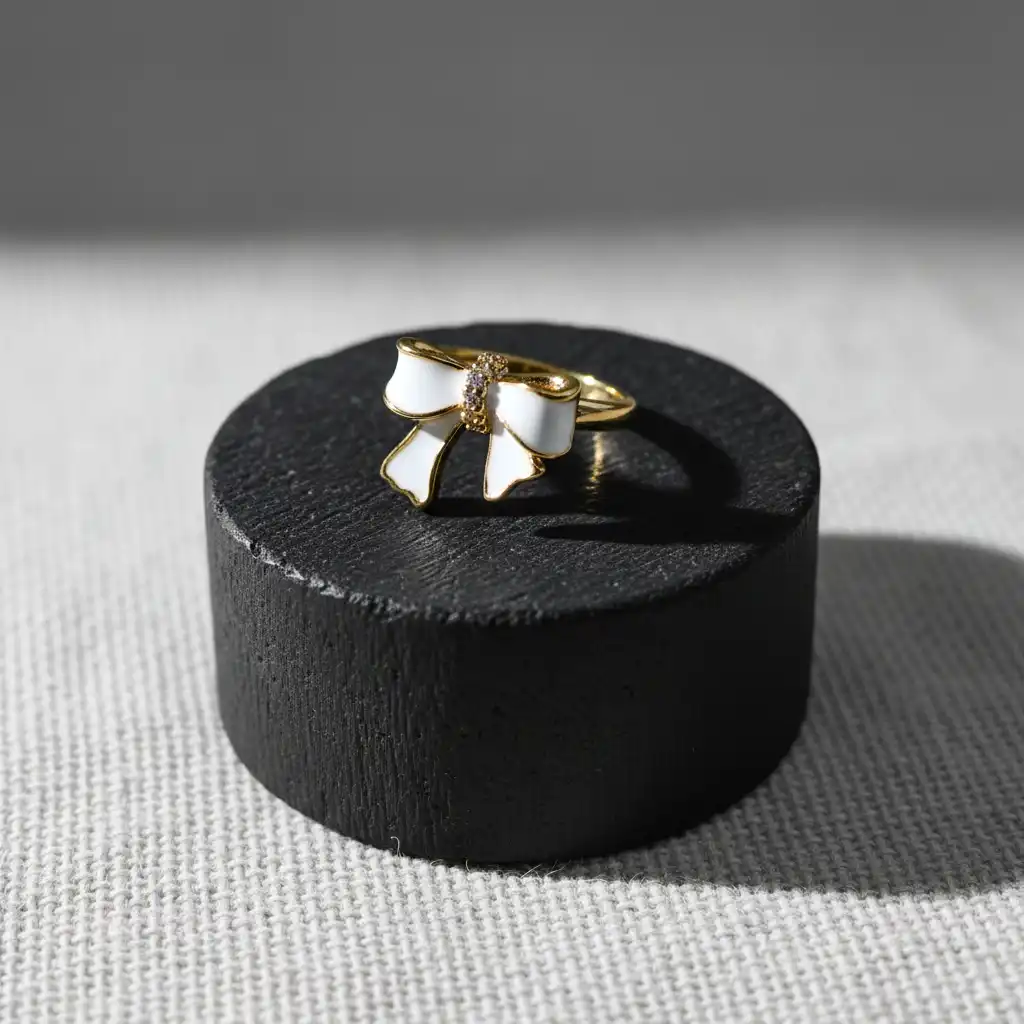 A charming bow-shaped statement ring, designed with graceful, feminine detailing and a delicate sparkle at the center. Its elegant silhouette blends playful coquette aesthetics with timeless sophistication, making it a standout piece for everyday glam or special occasions.