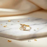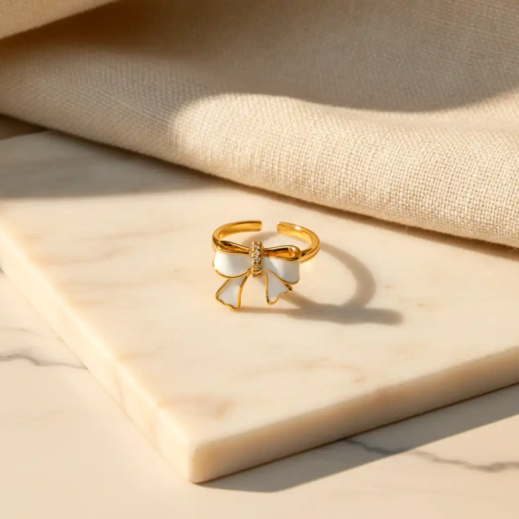 Material & Color: Crafted in anti-tarnish gold-tone alloy with white enamel detailing and micro zircon accents at the center for a subtle sparkle. Features a polished gold-and-ivory-white finish with an adjustable fit.