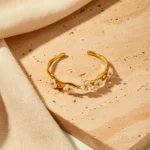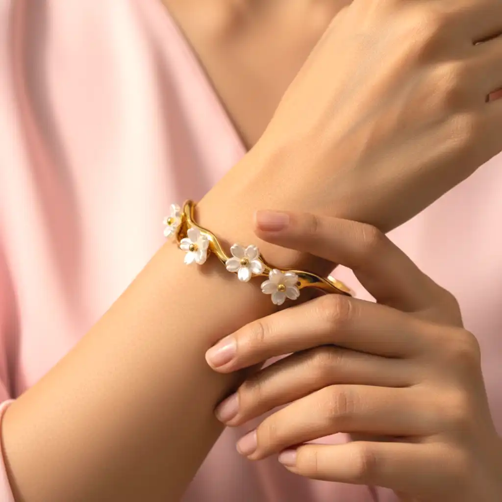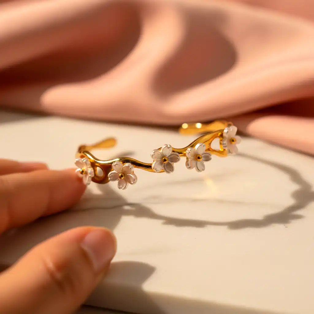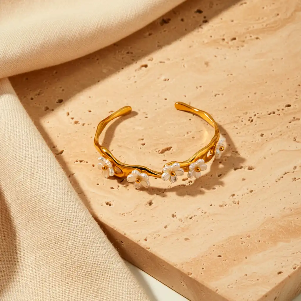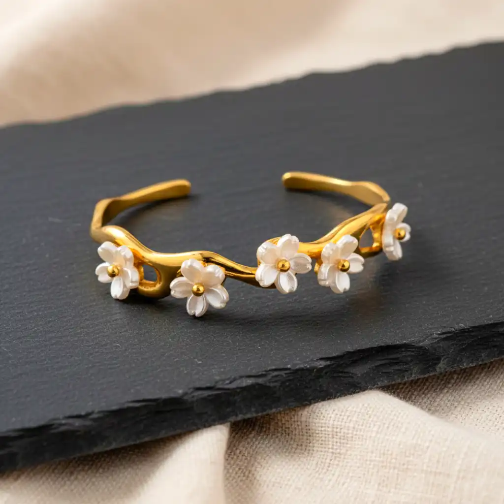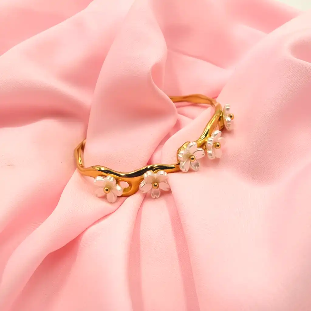 Inspired by blooming florals, this open cuff bracelet features delicate flower motifs that add a soft, dreamy aesthetic. It’s lightweight, feminine, and perfect for adding a touch of nature-inspired beauty to your style.