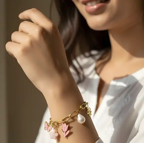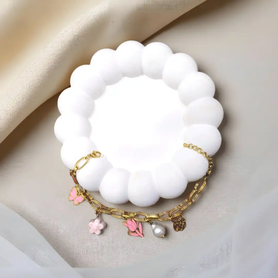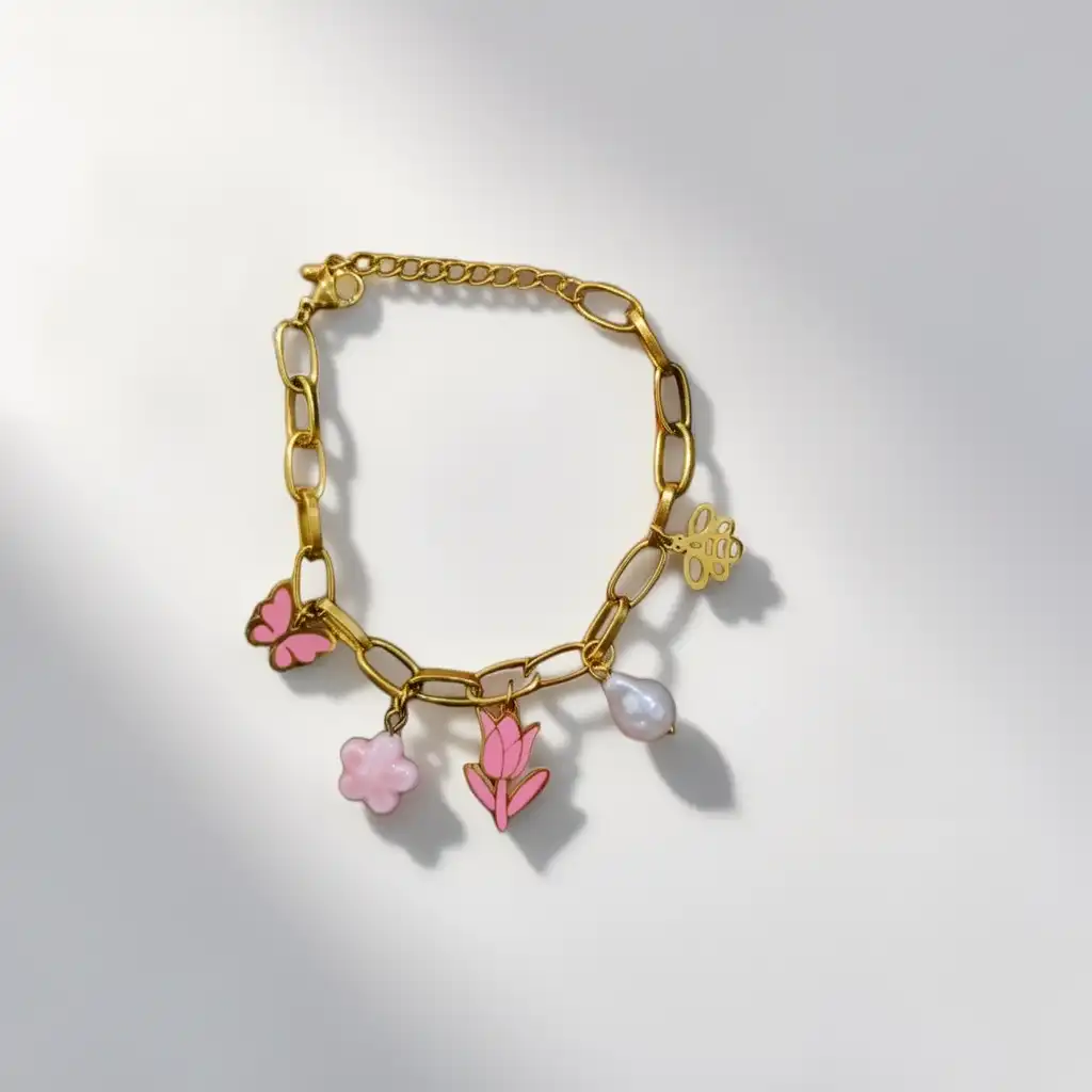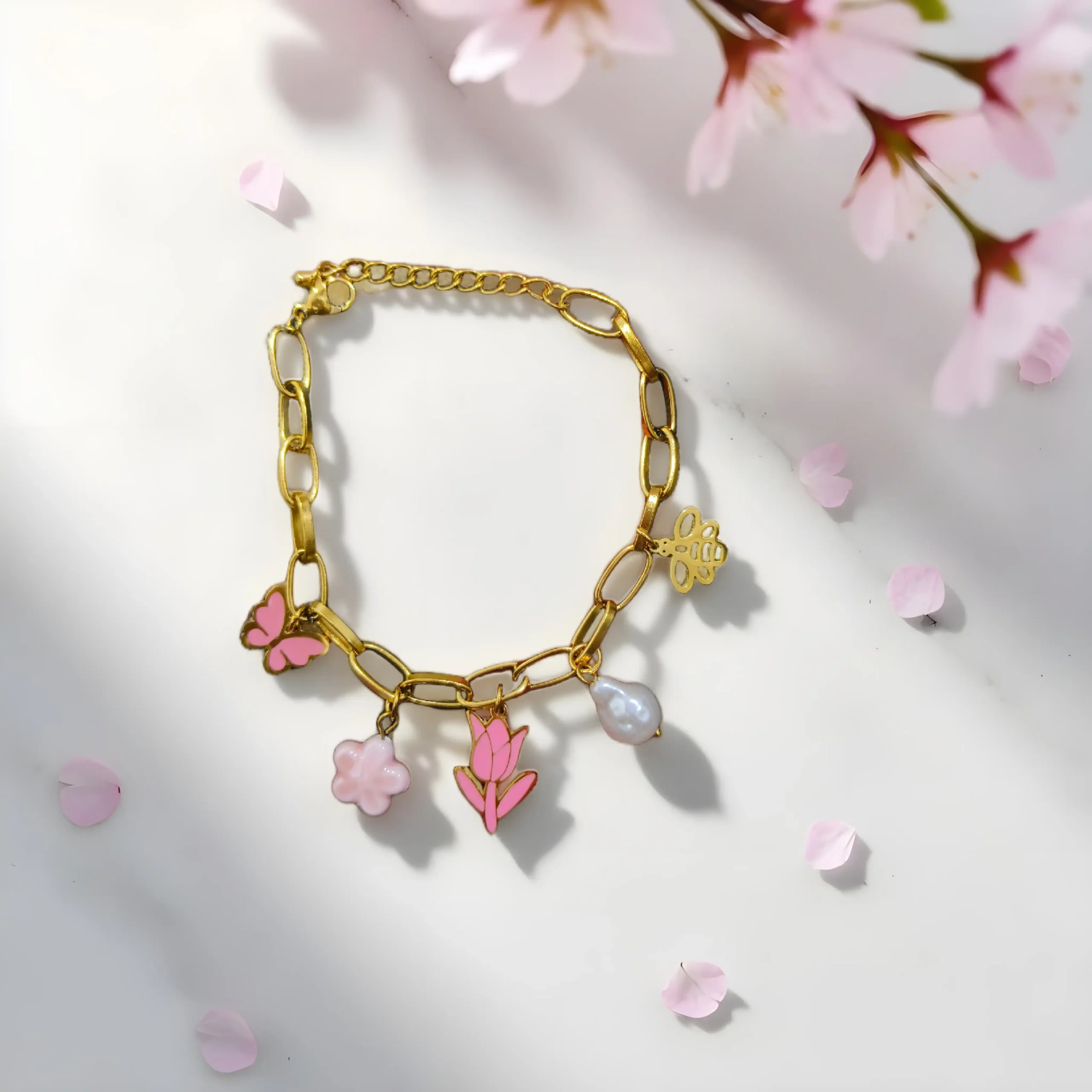 Sweet, whimsical, and full of personality, the Pretty in Pink bracelet is a celebration of soft femininity. Featuring enamel charms like butterflies, flowers, and pearls, it’s like wearing a piece of spring on your wrist. The size of the product may vary slightly.