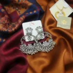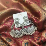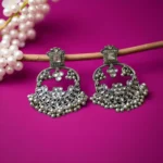 Material & Color: Crafted from premium quality brass with an oxidised silver finish, these earrings showcase a vintage-inspired antique tone. Embellished with high-quality white kundan-style stones and metallic bead drops, the overall color palette features classic oxidised silver with subtle white stone highlights.
