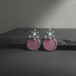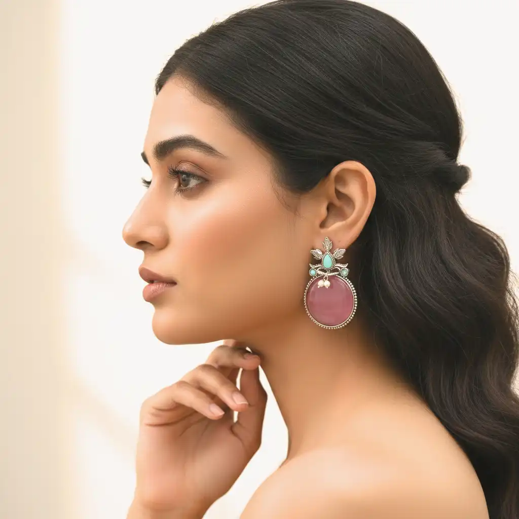 These stunning statement earrings feature a beautifully carved round blush pink stone set in a delicately detailed oxidised silver-toned base. The top is adorned with turquoise-blue stones and intricate leaf motifs, giving the piece a vintage ethnic charm.
