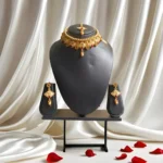 Inspired by regal Indian traditions, this grand necklace is a tribute to the divine feminine. Temple-style motifs, embossed golden beads, and accents of ruby pink and emerald green make it perfect for religious functions and wedding festivities. The intricacy speaks to a heritage passed down through generations.