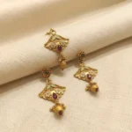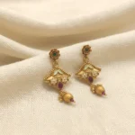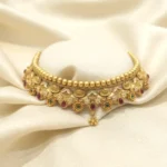 Description: Inspired by regal Indian traditions, this grand necklace is a tribute to the divine feminine. Temple-style motifs, embossed golden beads, and accents of ruby pink and emerald green make it perfect for religious functions and wedding festivities. The intricacy speaks to a heritage passed down through generations.