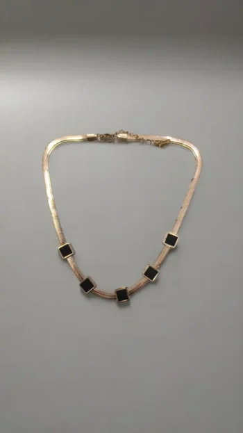 A chic gold-tone necklace featuring five black square accents, blending modern elegance with timeless style.