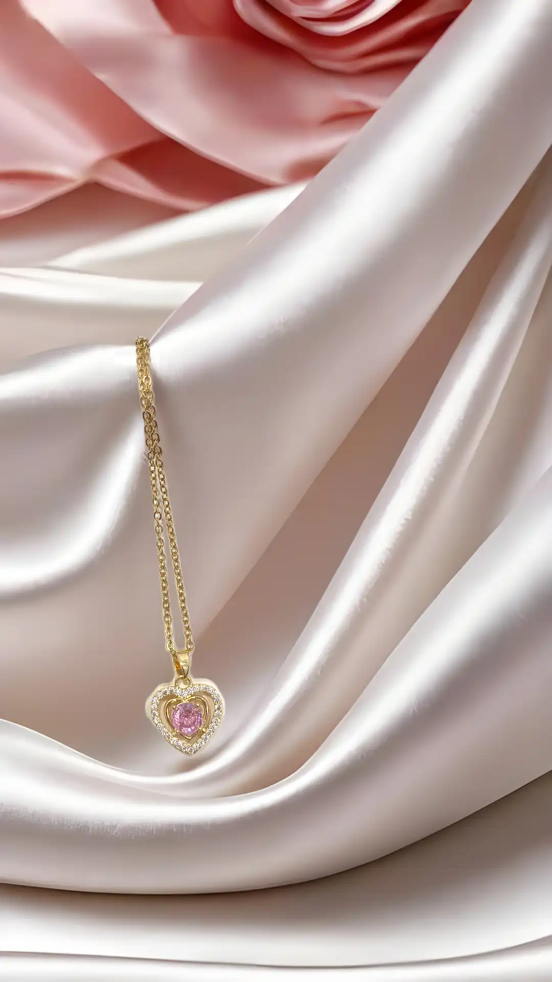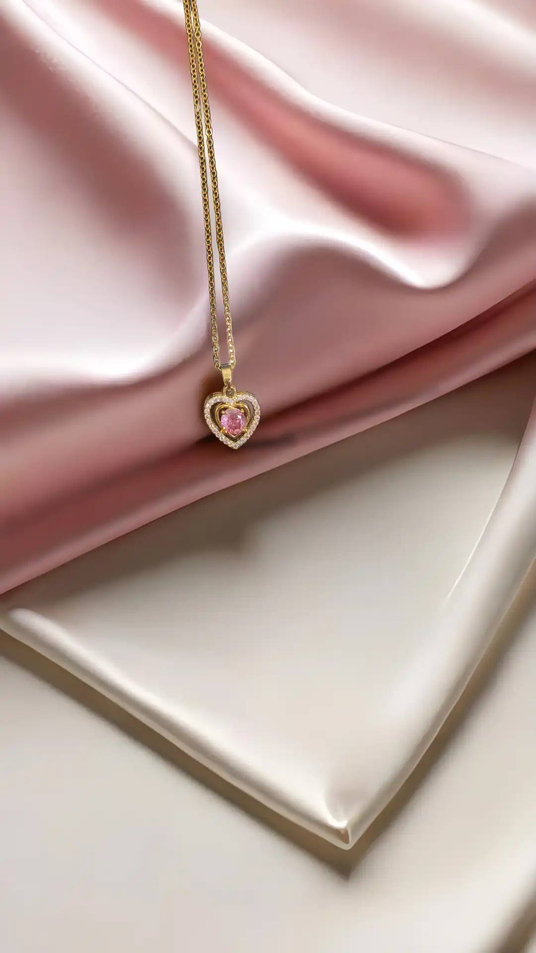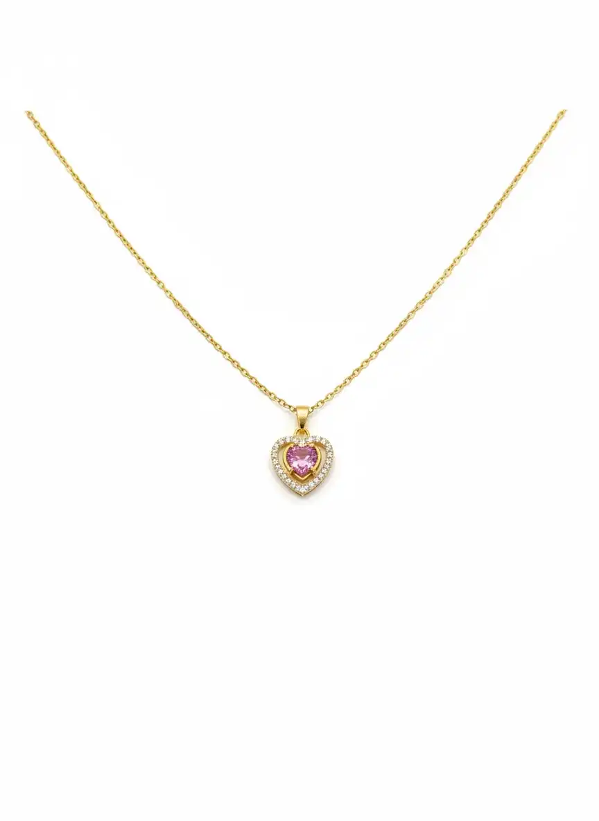 A romantic ANTI-TARNISH gold-plated necklace featuring a pink heart stone surrounded by sparkling CZ diamonds — perfect for daily elegance or special moments.