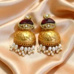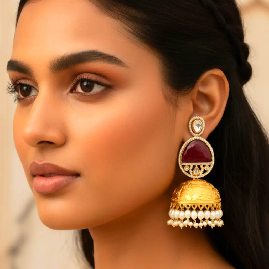 Styling Tips: Perfect for weddings, festive occasions, or ethnic events—pair these jhumkas with sarees, lehengas, or Anarkalis in shades like ivory, beige, maroon, or gold. They look especially stunning with warm-toned outfits and minimal neckpieces, letting the earrings be the statement. You can also style them with a sleek bun or soft curls to enhance the traditional elegance.