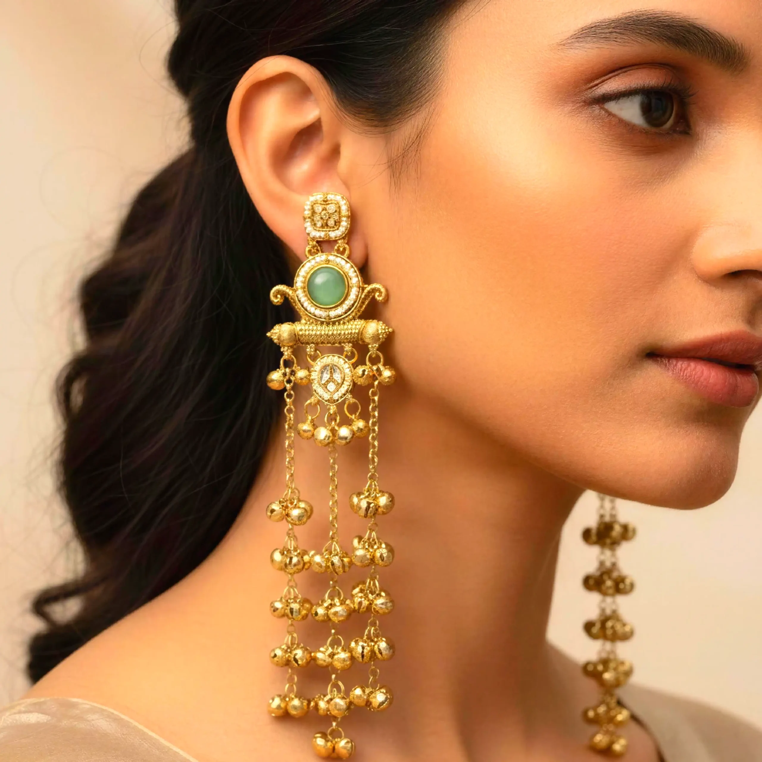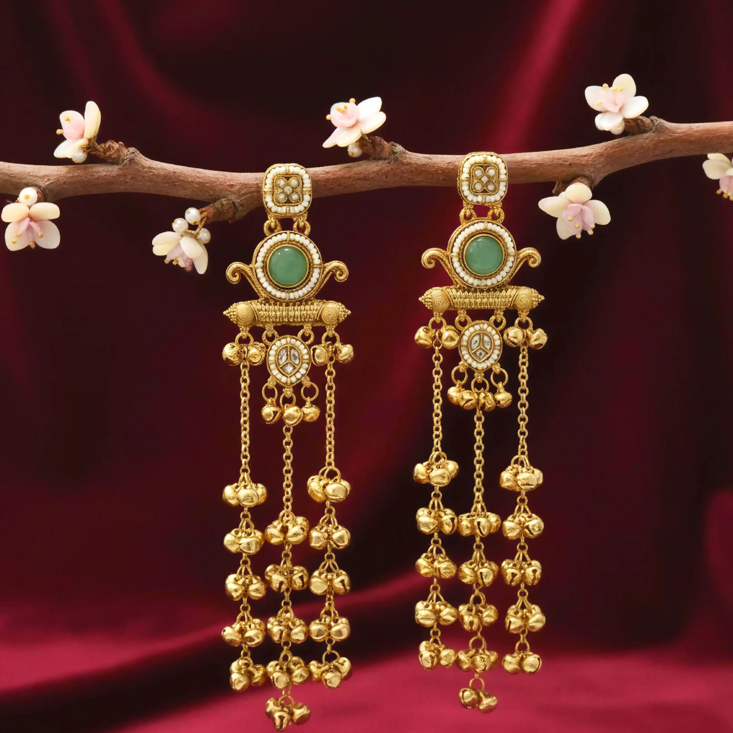 Material & Color: Crafted from premium alloy with a rich gold-plated finish, the earrings feature mint green stone detailing along with multiple golden ghunghroo danglers for a regal traditional appearance.
