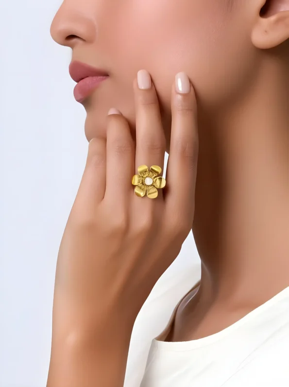 A statement floral ring with glossy golden petals and a pearl center, pure elegance with a vintage twist
